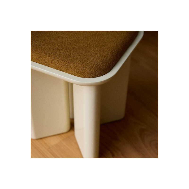 Son assise en bouclette crème crée un contraste subtil avec la structure laquée et offre un confort optimal grâce à un rembourrage en mousse polyuréthane anti-feu à haute densité (40 kg/m³). La structure en médium assure stabilité et durabilité, tandis que la fabrication au Portugal, dans un atelier certifié CARB 2, garantit un savoir-faire de qualité et le respect de normes exigeantes. Le tissu certifié OEKO-TEX témoigne d’une attention particulière portée aux matériaux utilisés.