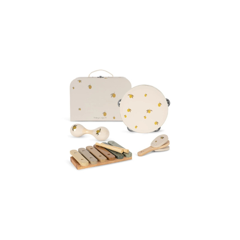 Cet ensemble d’instruments brillants réunit un tambourin, des castagnettes, des maracas et un xylophone avec ses baguettes, le tout rangé dans une petite valise pratique. Fabriqués en bois de hêtre, bois de thé et contreplaqué certifiés FSC™, ces instruments ludiques et durables sont parfaits pour éveiller les enfants à la musique dès 3 ans.