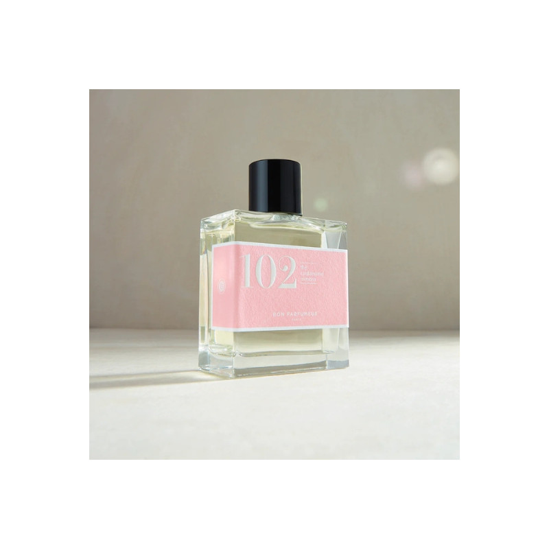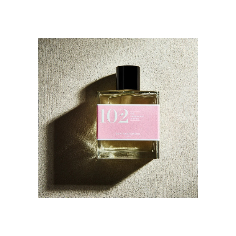Un parfum comme une pause contemplative, une tasse de thé vert fumant, quelques fleurs fraîchement coupées, et une touche d’épices qui électrise les sens. 102 de chez Bon Parfumeur, c’est la délicatesse d’un thé jasmin au soleil, relevé par la cardamome épicée et arrondi par un sillage poudré et boisé.
