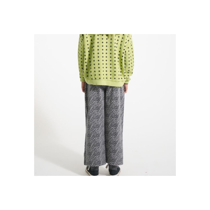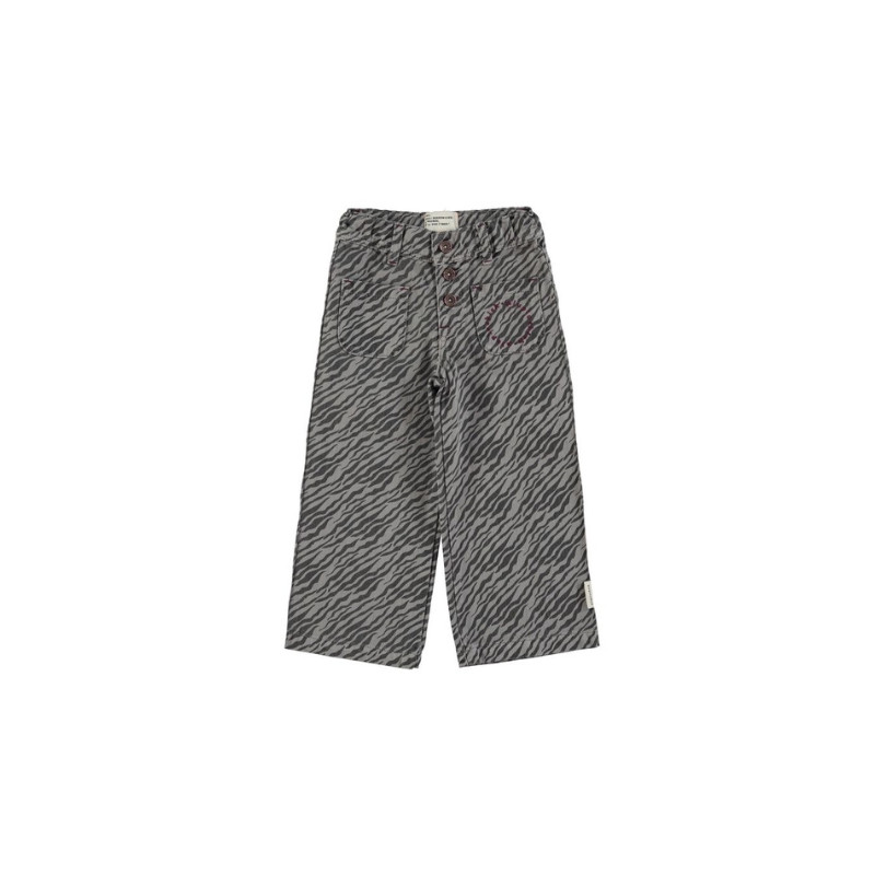 Pantalon évasé Piupiuchick AW25 en sergé de coton biologique. Imprimé zèbre gris, taille ajustable avec passants, boutonnage devant, deux poches dont une brodée. 100 % coton.