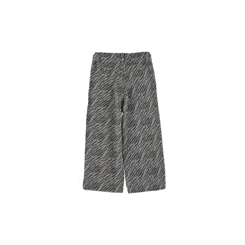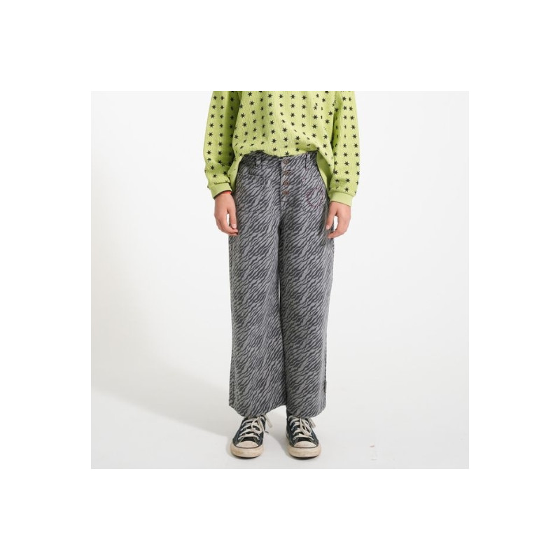 Pantalon évasé Piupiuchick AW25 en sergé de coton biologique. Imprimé zèbre gris, taille ajustable avec passants, boutonnage devant, deux poches dont une brodée. 100 % coton.