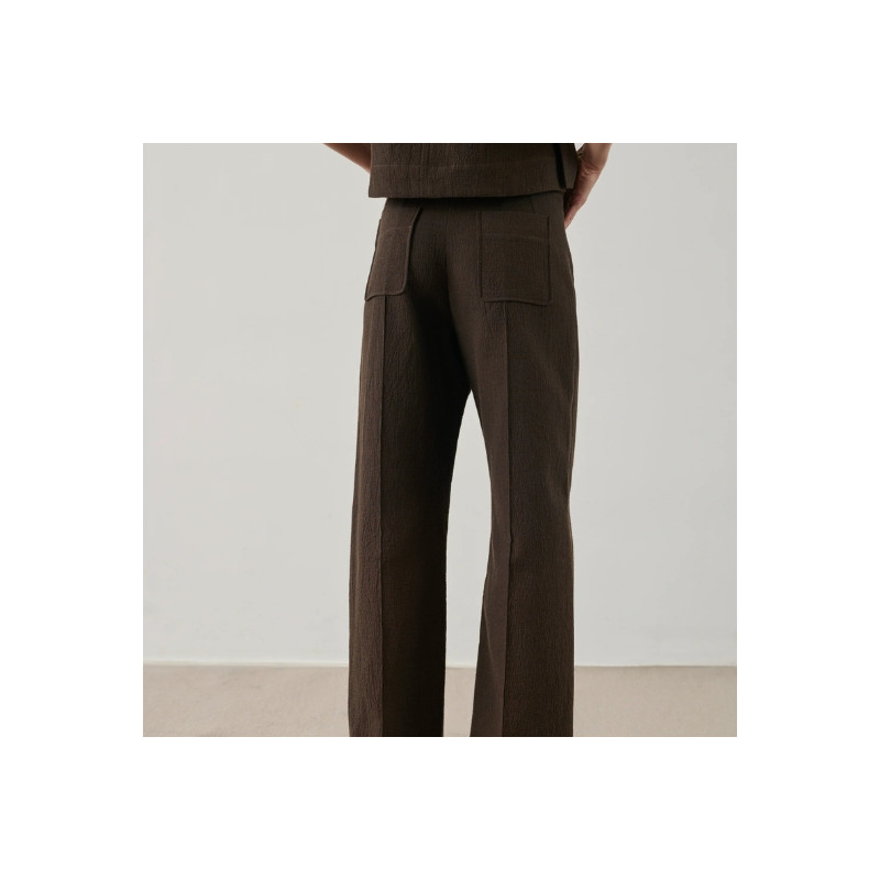 Ce pantalon séduit par sa coupe droite légèrement évasée qui allonge la silhouette tout en restant facile à porter au quotidien. L’ouverture zippée avec bouton pression apporte une finition nette et pratique. Les poches plaquées à l’avant et au dos renforcent son esprit utilitaire tout en restant discrètes. Le pli marqué le long de la jambe structure la ligne et donne une allure plus soignée. Confectionné en coton gaufré, il offre une texture subtile et un tombé naturel qui apporte du caractère à la pièce.