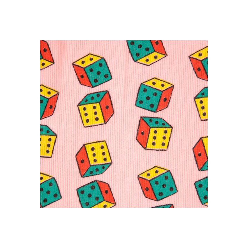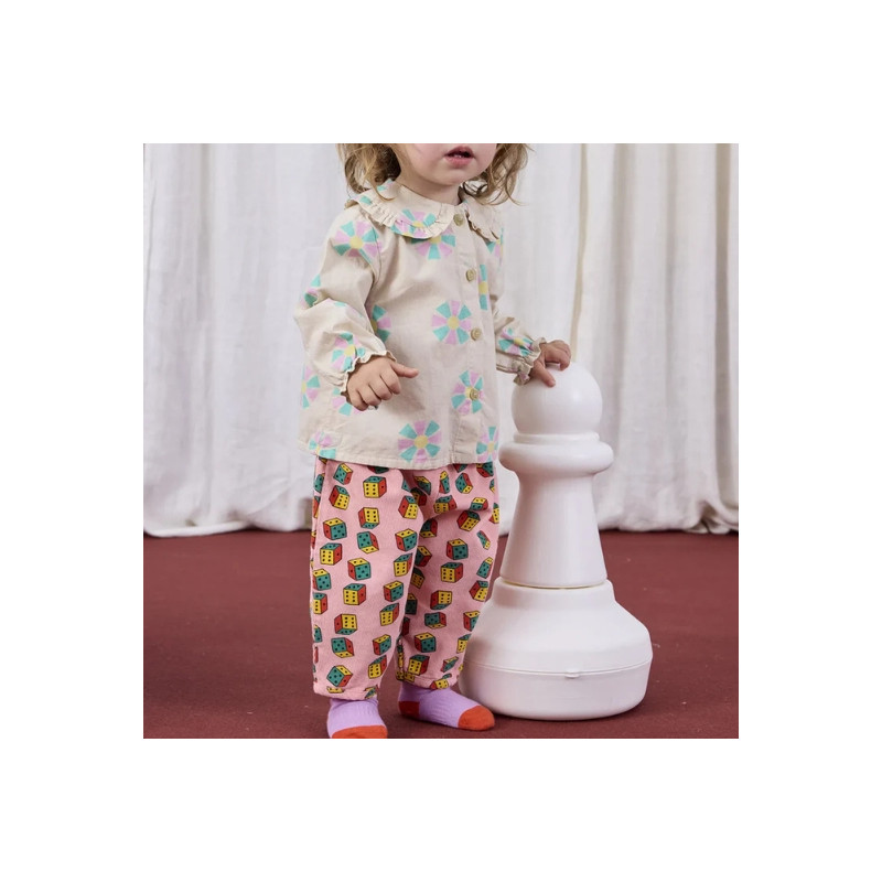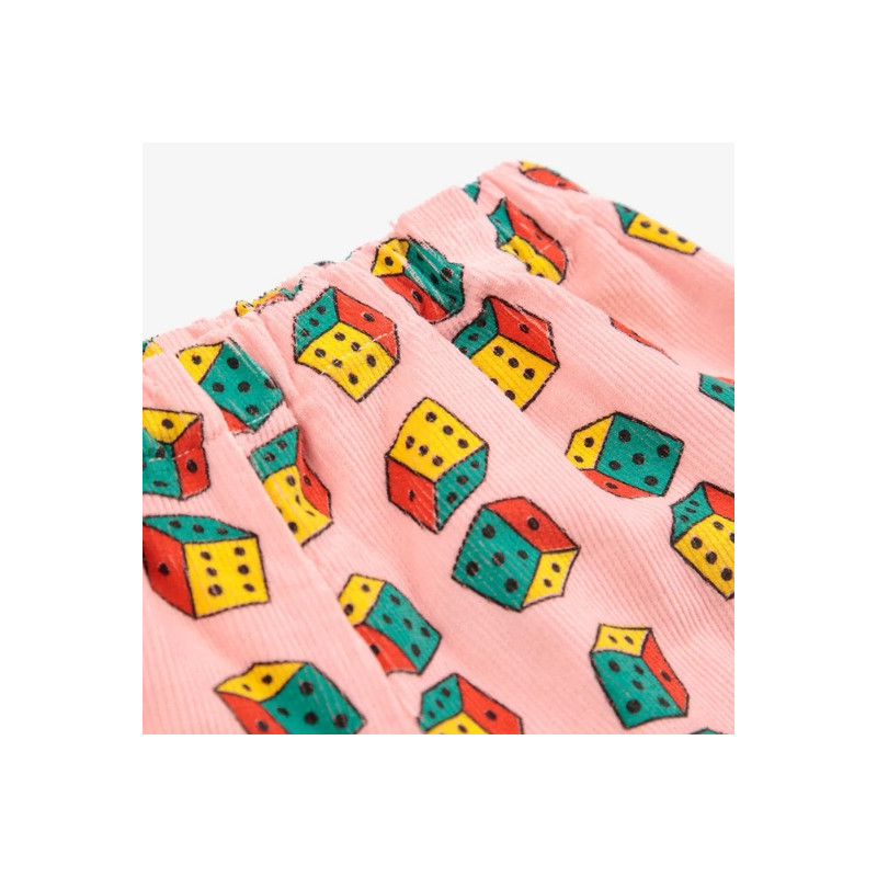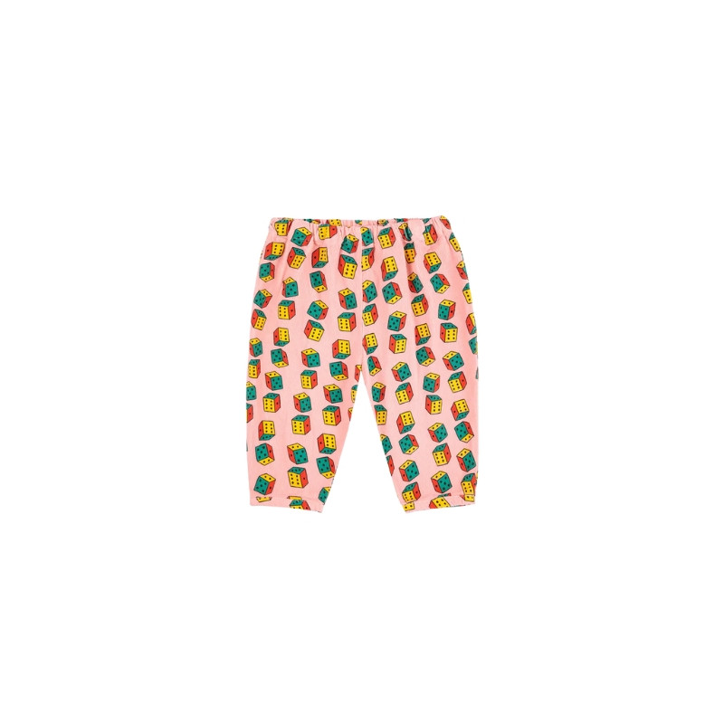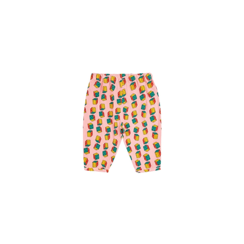 Pantalon rose à imprimés dés, en coton biologique. Coupe cocon confortable et taille élastique. Doux, ludique et fabriqué en Espagne.
