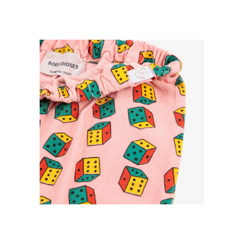 Ce pantalon en velours de la marque Bobo Choses séduit par sa teinte rose douce et ses imprimés dés ludiques. Il est doté d'une taille élastique et d'une coupe cocon confortable, parfaite pour accompagner les mouvements des tout-petits. Confectionné en coton biologique, il est aussi doux que responsable. Fabriqué en Espagne.