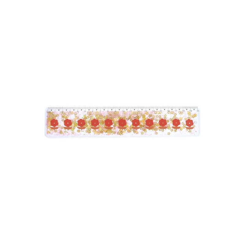 Règle de 20 cm en plastique transparent, décorée de fleurs rouges et de paillettes dorées flottantes. Solide, légère et pratique, elle apporte une touche ludique et colorée aux fournitures scolaires.