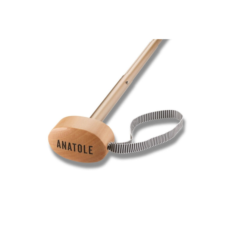 | COMPOSITION | TOILE : 100% recyclée (rPET) tissu microfibres 190 microfils - ATTACHE : bouton pression métal gravé - POIGNÉE : bois naturel avec logo « ANATOLE » gravé |