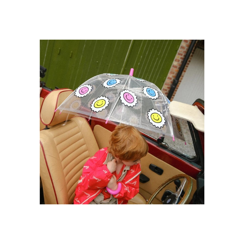 Il pleut, il mouille, et avec ce parapluie smiley Mathilde Cabanas, c’est la fête sous la pluie ! Conçu pour les petites étoiles qui savent que chaque goutte d'eau est une bonne excuse pour sourire, ce parapluie transparent en forme de cloche est là pour transformer chaque jour pluvieux en arc-en-ciel de bonne humeur !