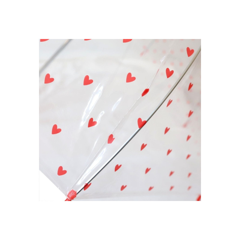 Parapluie transparent à imprimé cœurs rouges, pratique et stylé pour rester protégé tout en gardant une bonne visibilité sous la pluie.