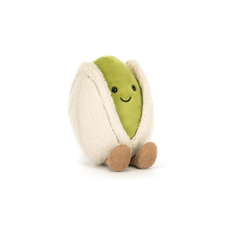 Peluche Amuseables Pistachio de Jellycat, une adorable pistache au sourire malicieux. Avec sa coque crème toute douce et sa graine verte moelleuse, elle est prête à semer la bonne humeur partout où elle passe.