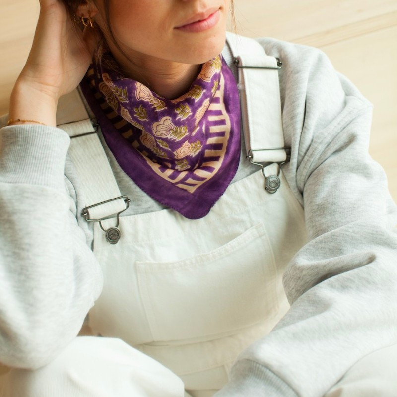 Avec ses couleurs dans les tons violet et nude, son graphisme joyeux et moderne, ce petit Foulard en soie est un must have à mettre dans les cheveux, sur son sac à main, au poignet ou autour du cou. Les pigments de couleurs sont d'origine naturelle, appliqués grâce à un tampon taillé dans le bois et la confection est réalisée dans le respect du produit et de l’environnement.