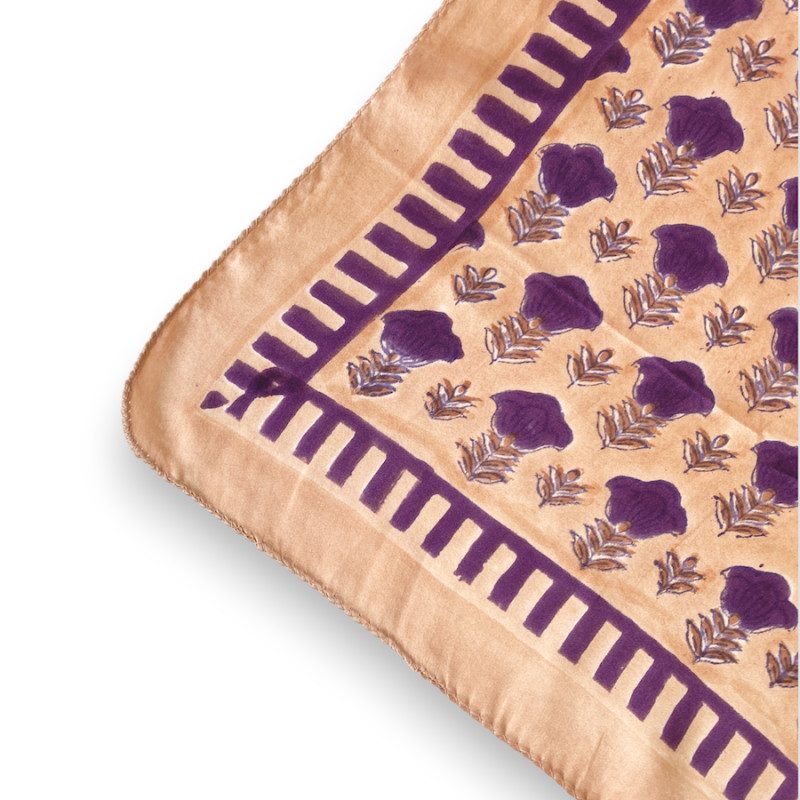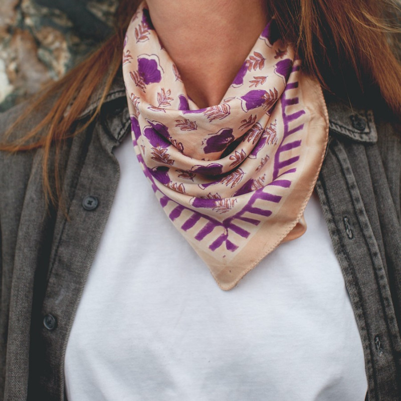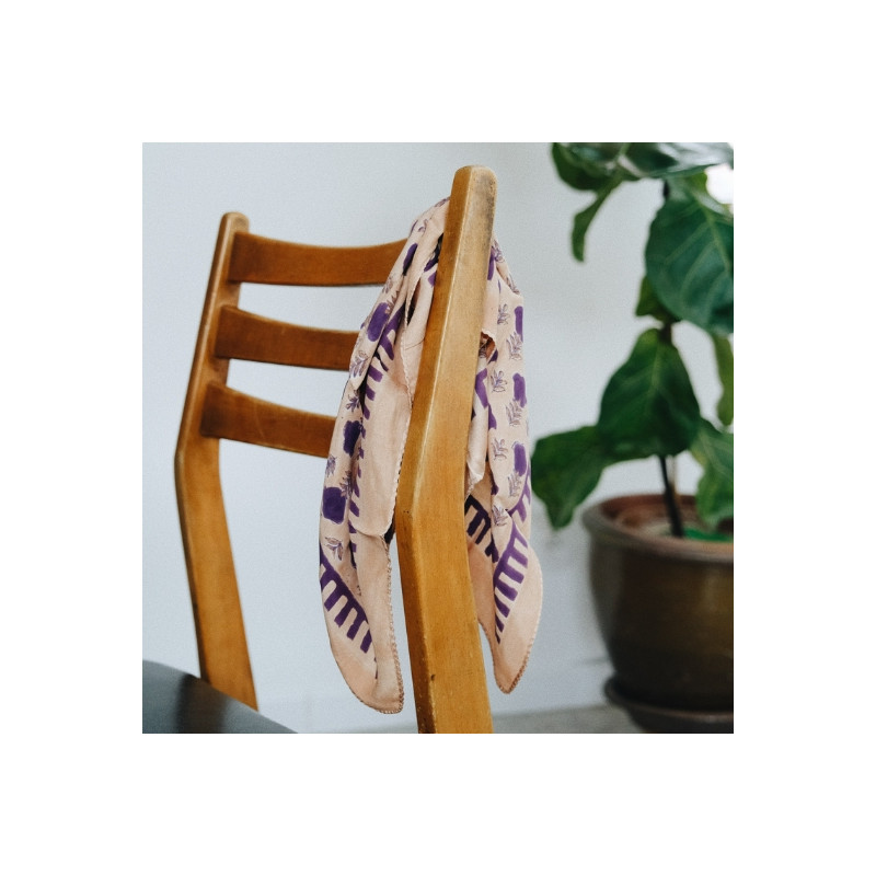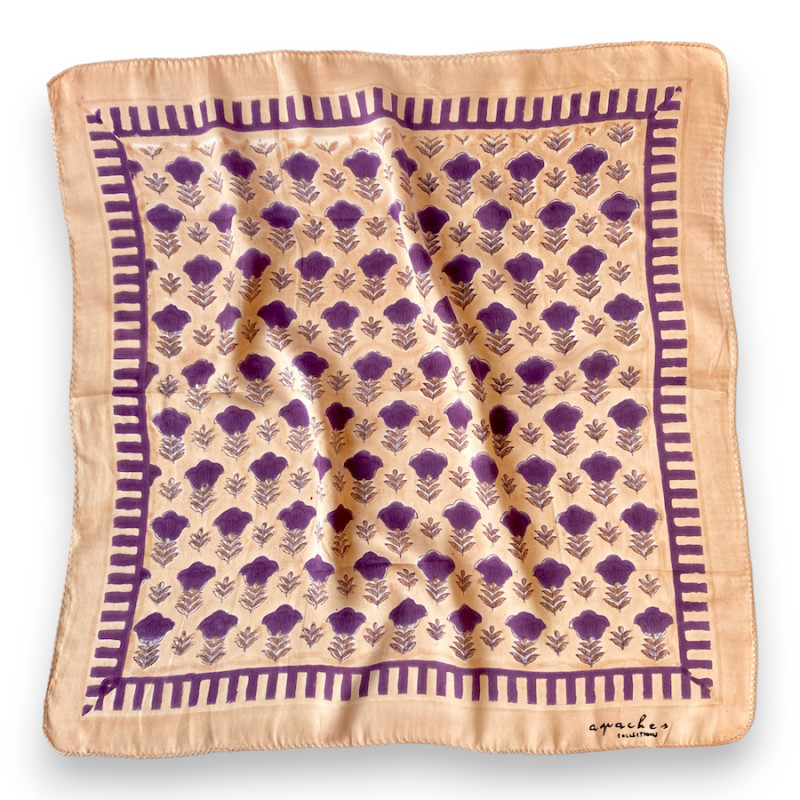 Ce petit foulard (50 x 50 cm) dans les tons de crème et violet viendra pimper vos tenues et vous apportera tout le réconfort de la soie douce et voluptueuse. Les pigments de couleurs sont d'origine naturelle, appliqués grâce à un tampon taillé dans le bois. La confection est réalisée dans le respect du produit et de l’environnement.