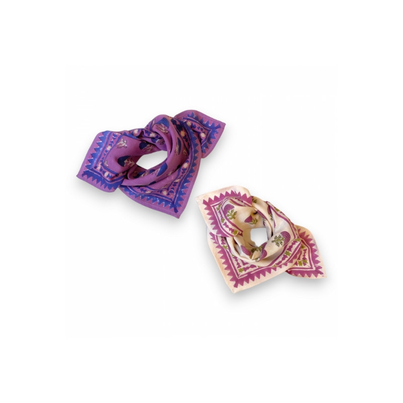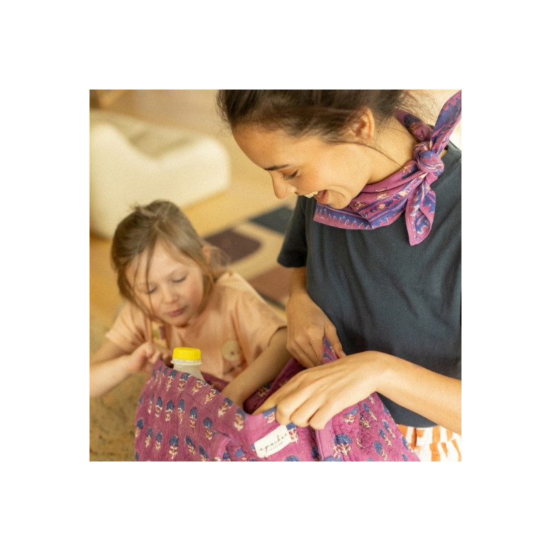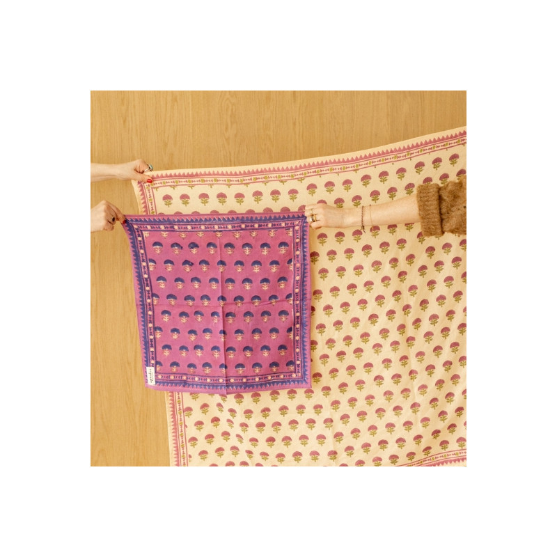 Il est confectionné artisanalement grâce à la technique indienne du block-print. Ses couleurs sont réalisées à partir de pigments naturels. Cette confection manuelle peut entraîner certaines "irrégularités", ce qui en fait tout son charme.