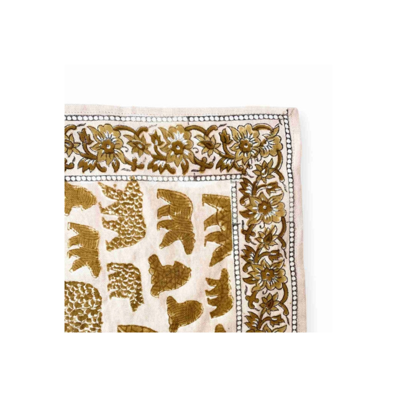 Les motifs sont ensuite confectionnés en Inde en utilisant la technique traditionnelle du block-print. Ce procédé artisanal consiste à imprimer les tissus à la main, à partir de tampons sculptés dans le bois et de pigments naturels. Ce savoir-faire ancestral rend chaque pièce unique, reflétant le travail minutieux et l'expertise des artisans indiens.