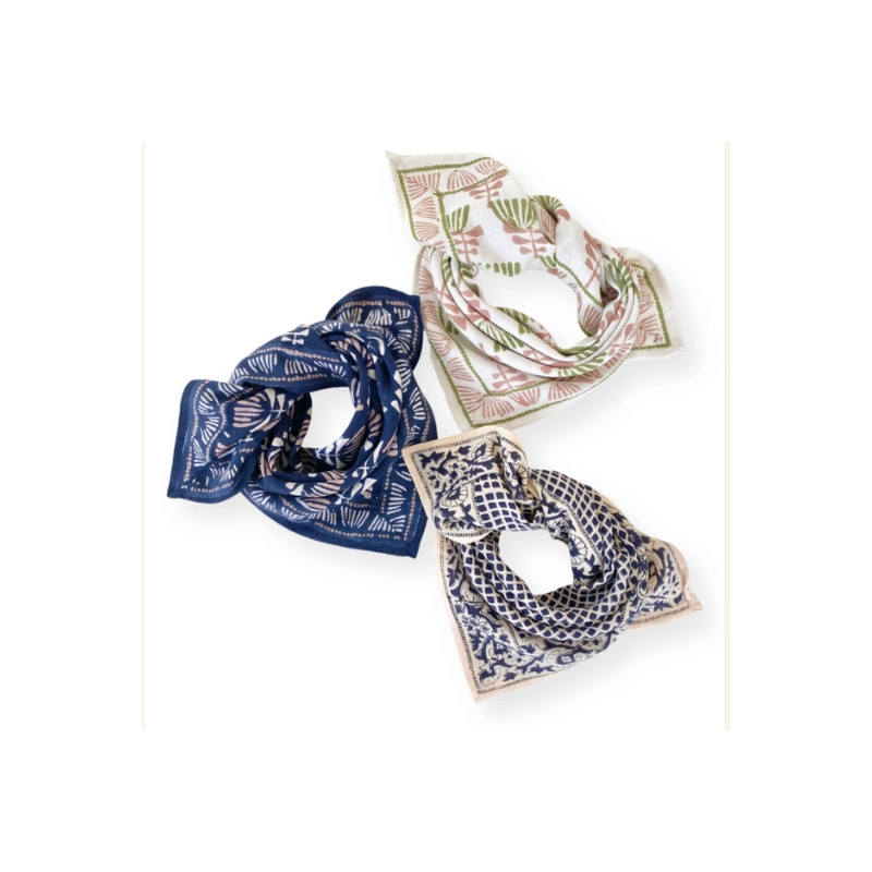 Les motifs sont ensuite confectionnés en Inde en utilisant la technique traditionnelle du block-print. Ce procédé artisanal consiste à imprimer les tissus à la main, à partir de tampons sculptés dans le bois et de pigments naturels. Ce savoir-faire ancestral rend chaque pièce unique, reflétant le travail minutieux et l'expertise des artisans indiens.