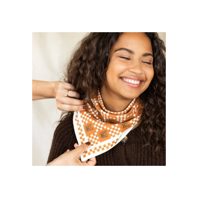 Le foulard Manika tigro camel de Apaches Collections séduit par son motif tigre audacieux et ses détails graphiques. Confectionné en coton, ce carré 50x50 cm se noue de multiples façons et apporte une touche chaleureuse et stylée à toutes vos tenues, en toute saison.