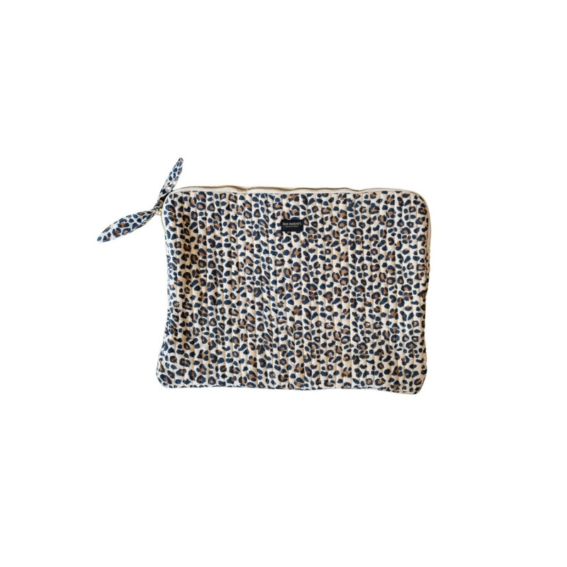 Pochette matelassée léopard beige de la marque Love Explorers, en coton imprimé léopard. Fermeture zippée avec nœud assorti. Pratique, résistante et stylée.