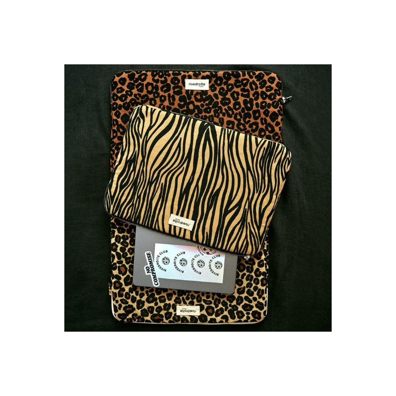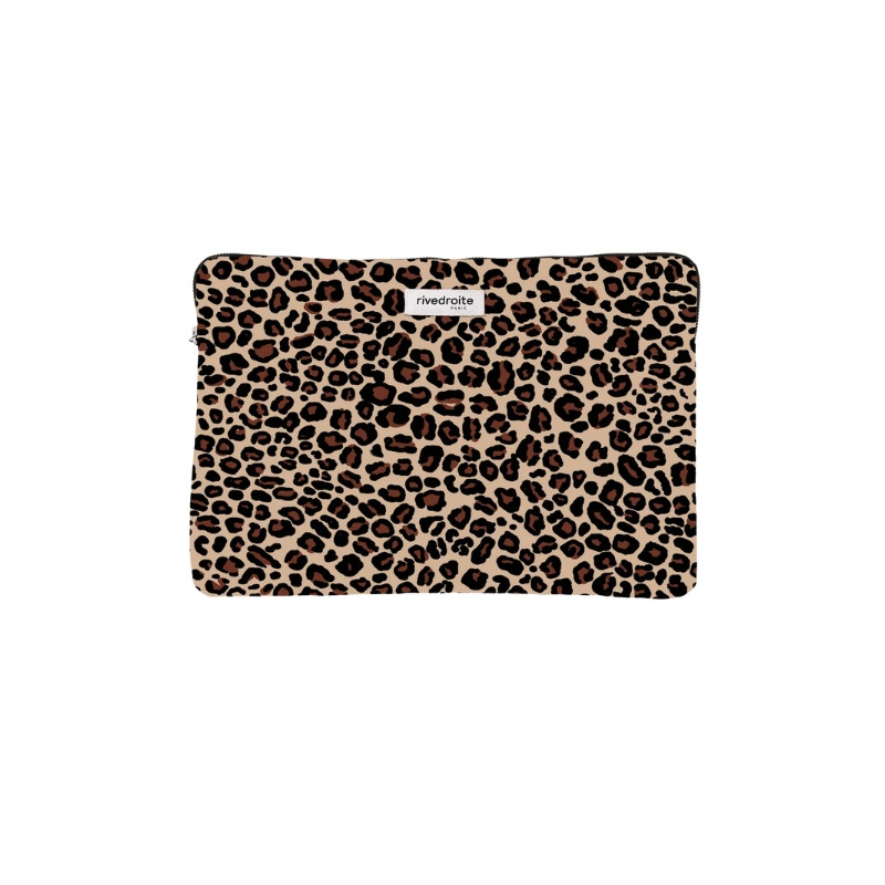La housse d’ordinateur Vivienne 15" de Rive Droite, en coton recyclé imprimé léopard beige, allie protection et style. Matelassée et doublée de tissu upcyclé, elle protège votre ordinateur avec élégance.