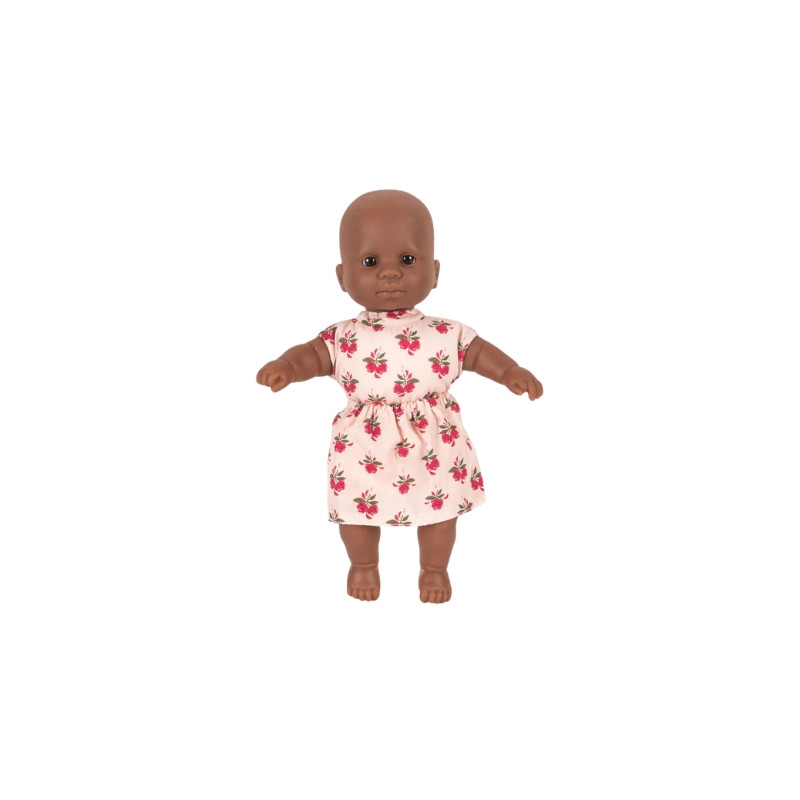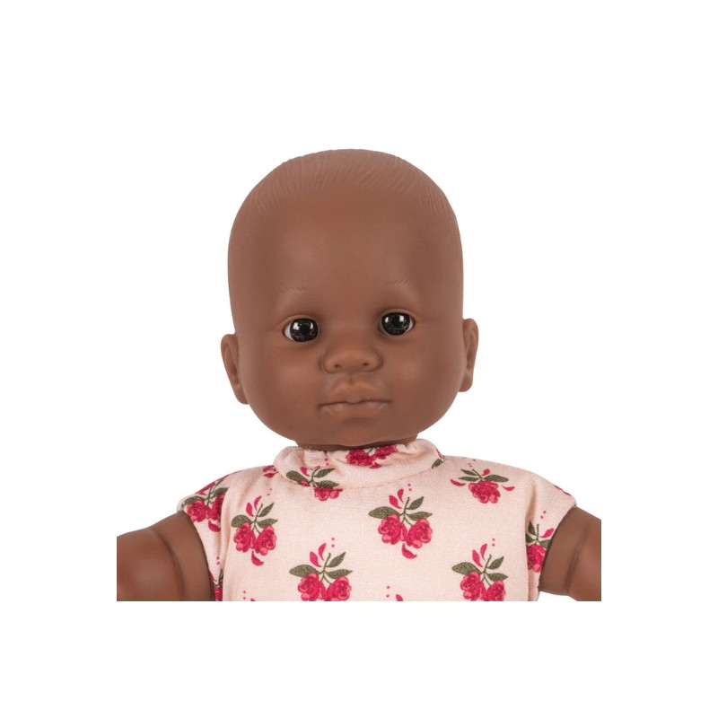 Mini-poupée douce et souple vêtue d’un ensemble fleuri amovible, parfaite pour les jeux d’imitation et les câlins.