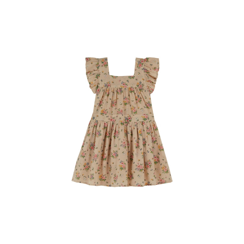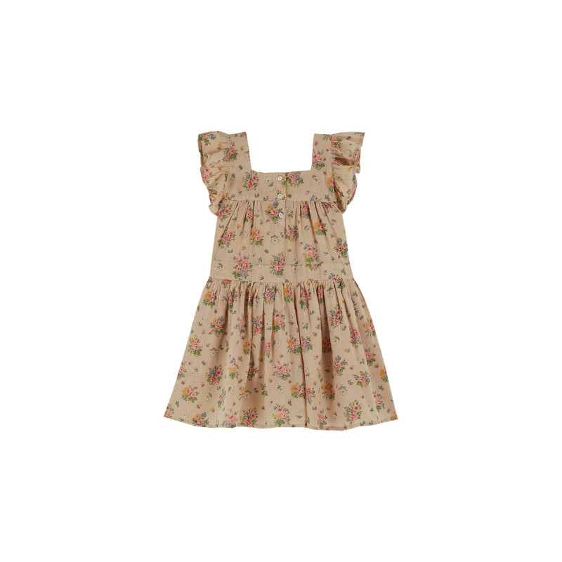 Cette robe au look vintage de la marque Emilie & Ida est conçue en gaze de coton. Elle dispose d'une encolure carrée, de volants au niveau des manches, de fronces à la ceinture et à la poitrine. Il y a une légère ouverture dans le dos se fermant par deux boutons en nacre naturelle. Cette robe est entièrement doublée et est ornée d'un joli imprimé floral.
