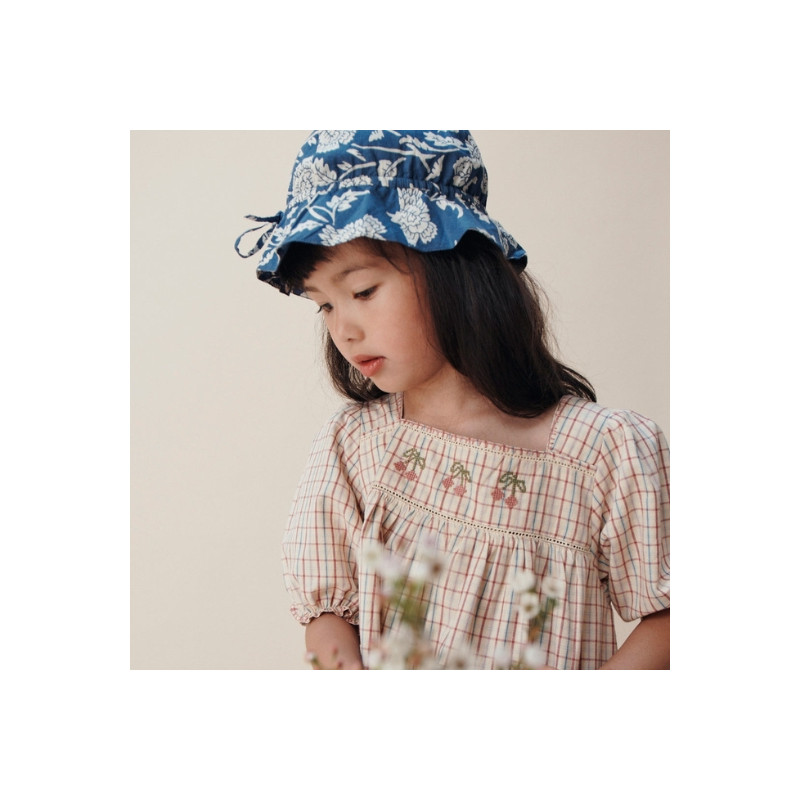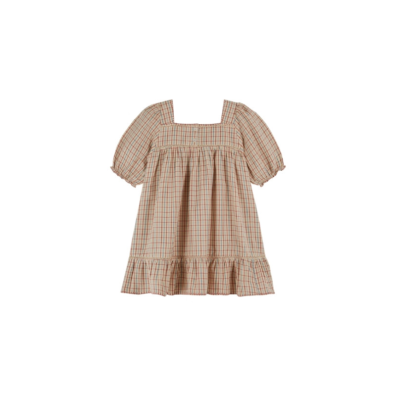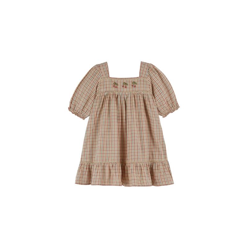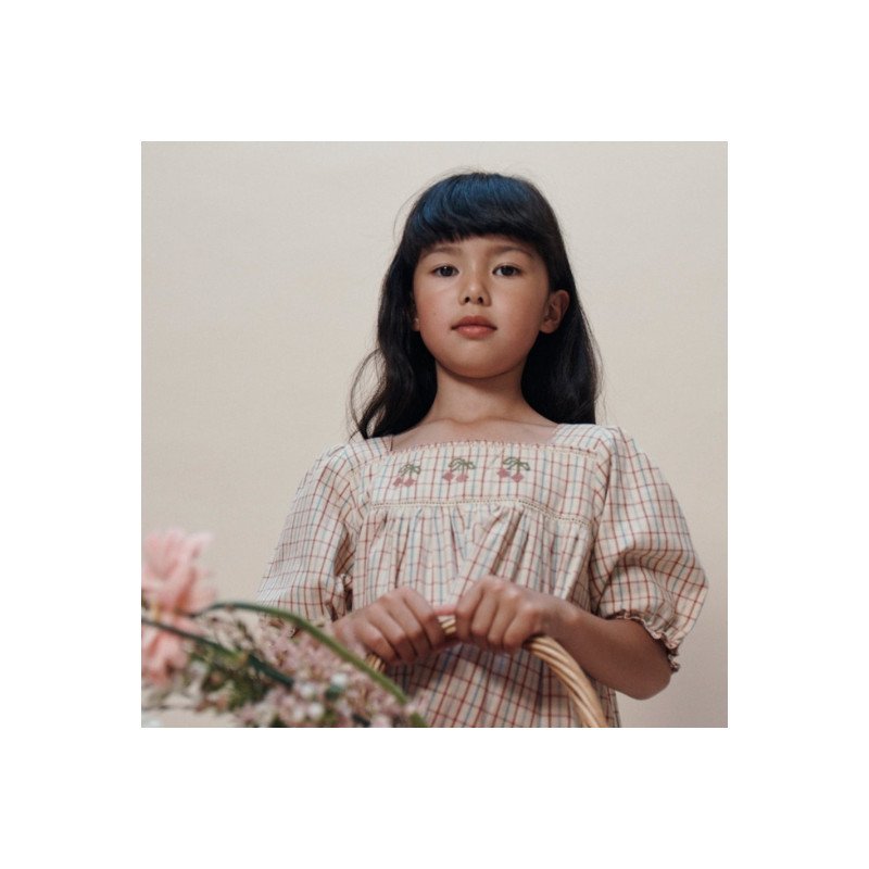 Cette robe de la marque Emilie & Ida est conçue en coton. Elle dispose d'une encolure carrée, de manches ballons élastiquées et de bordures soulignées par un point de broderie. Il y a une légère ouverture dans le dos se fermant par deux boutons en nacre naturelle. Cette robe est réhaussée de cerises brodées au point de croix et d'un imprimé à carreaux rose, bleus et rouges.