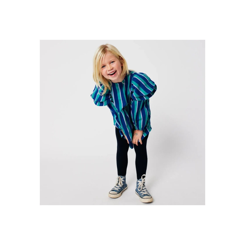 Robe enfant bleue BOBO CHOSES en coton biologique. Coupe évasée, manches longues, poignets élastiques, fronces et fermeture boutonnée au dos. Fabriquée en Espagne.