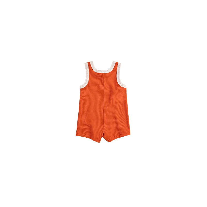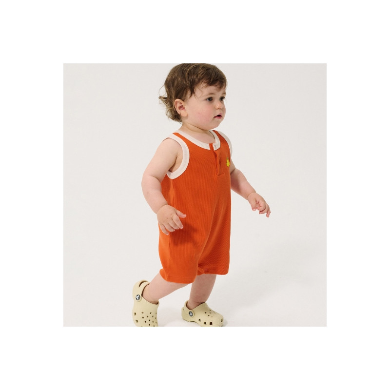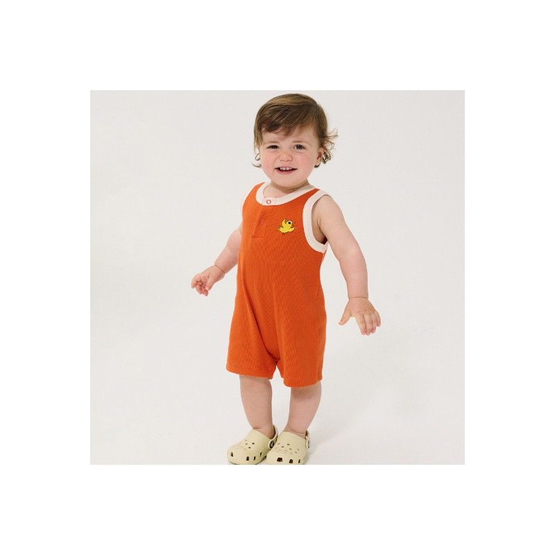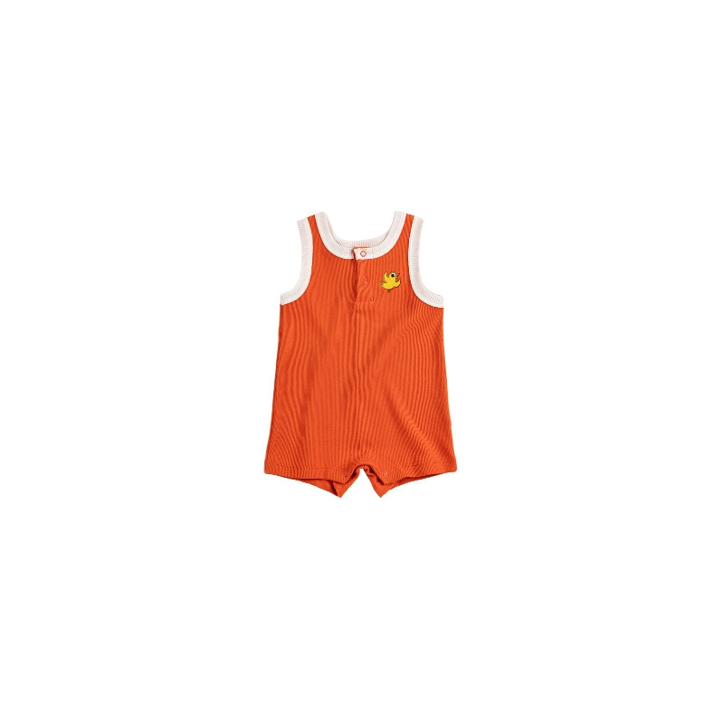 La combinaison Flying Oranges séduit par sa maille côtelée douce et sa teinte orange lumineuse. Sans manches, elle est pensée pour le confort des bébés pendant les journées chaudes. Les boutons-pression à l’entrejambe facilitent le change, tandis que le petit motif brodé apporte une touche ludique et estivale.