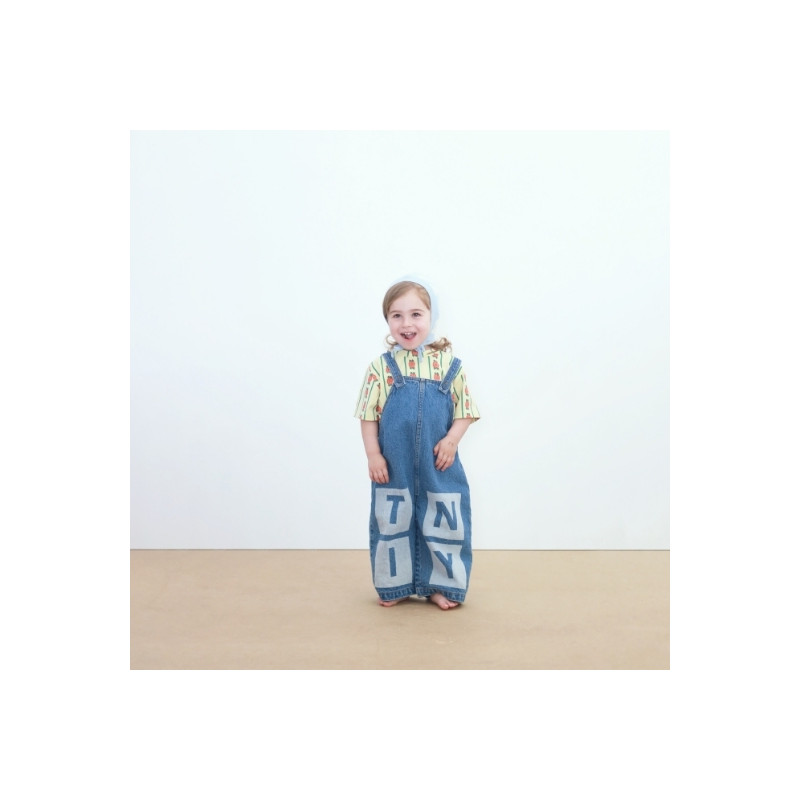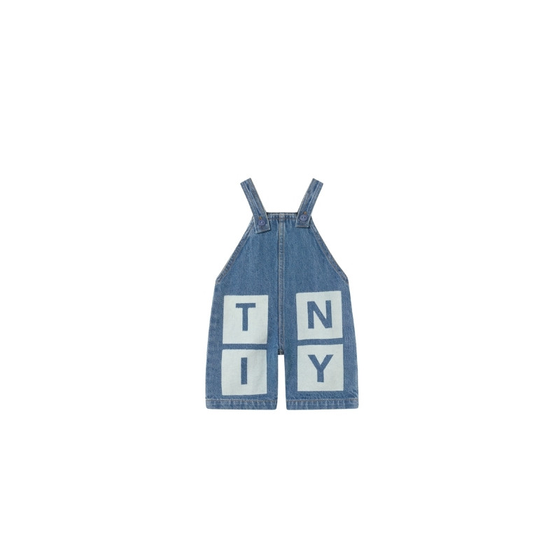 Salopette bébé en denim bleu délavé avec bretelles boutonnées et motif TINY graphique. Une pièce pratique et stylée, idéale pour un look casual et confortable.