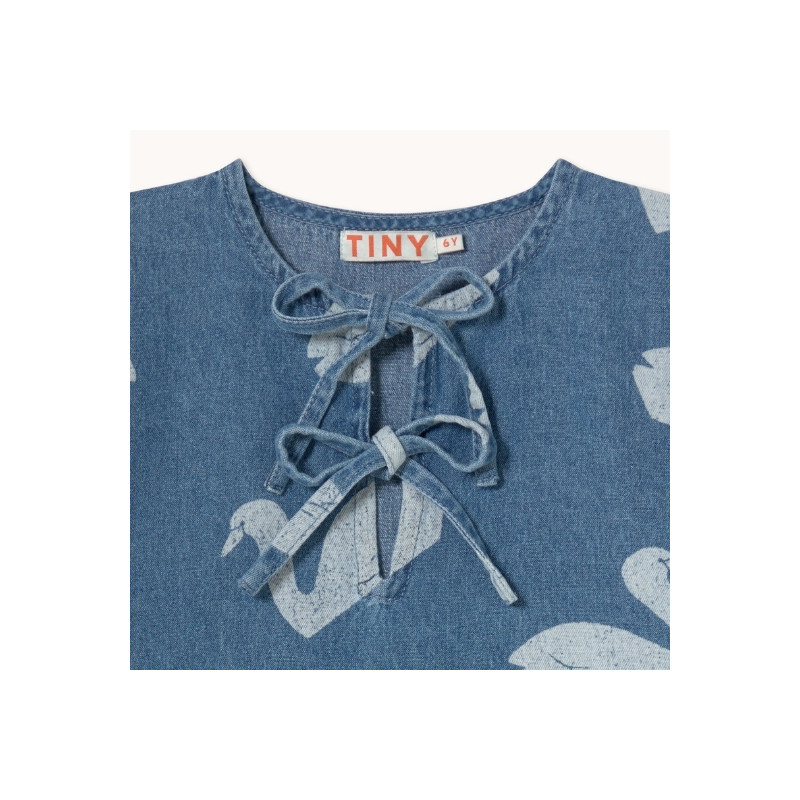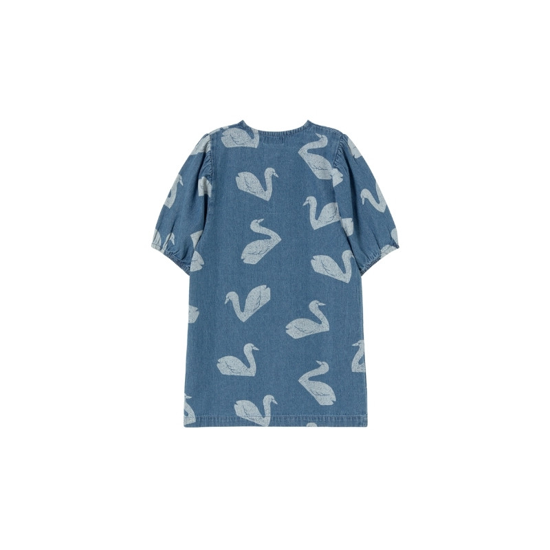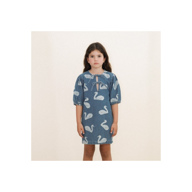 Robe en denim bleu à imprimé cygnes, avec manches bouffantes et détail lacé sur le devant. Une pièce confortable et pleine de charme pour le quotidien.