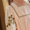 La robe Augustine séduit par sa silhouette ample et son charme bohème délicatement brodé. Son joli décolleté est souligné d’une frise brodée aux accents raffinés, tandis que les manches volantées se parent d’un florilège de fleurs finement brodées pour une touche poétique.