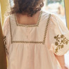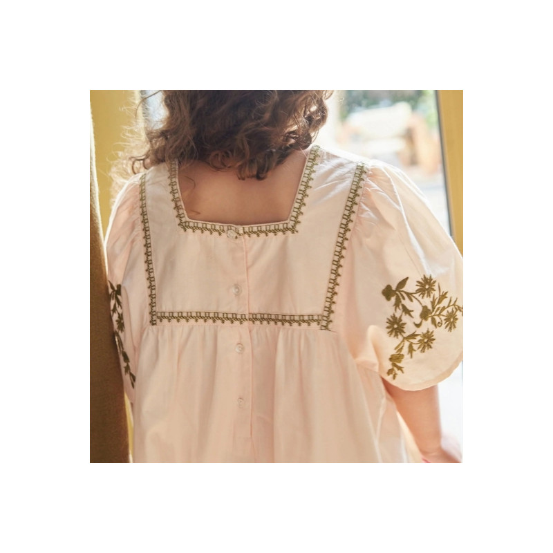 La robe Augustine charme par sa coupe ample, ses broderies délicates et sa popeline de coton douce. Une pièce bohème et élégante, idéale au quotidien.