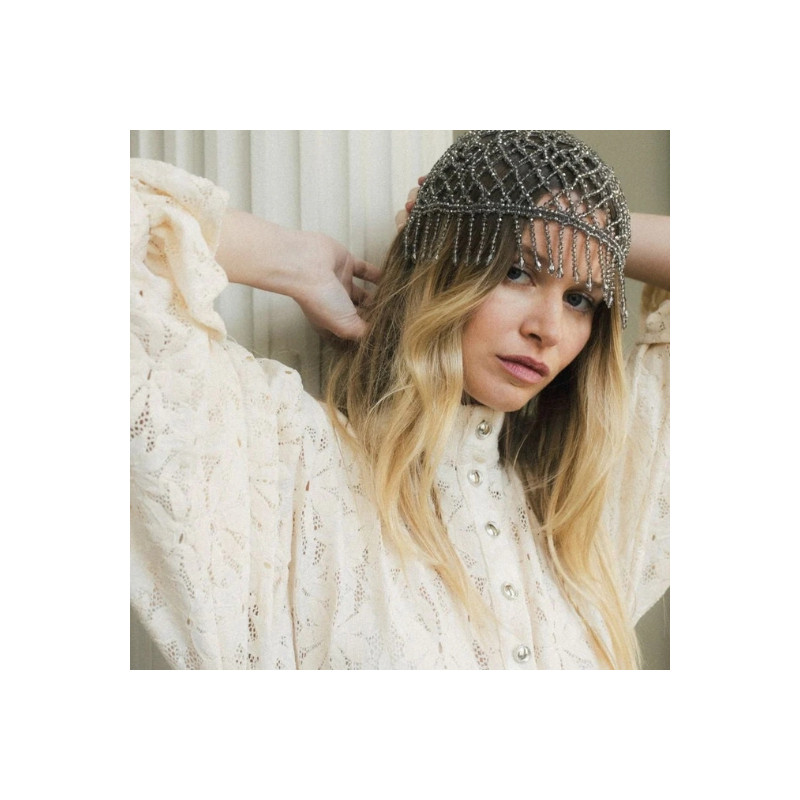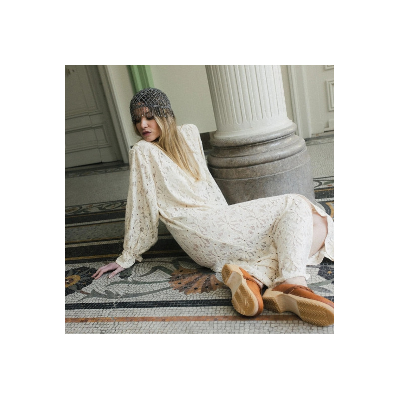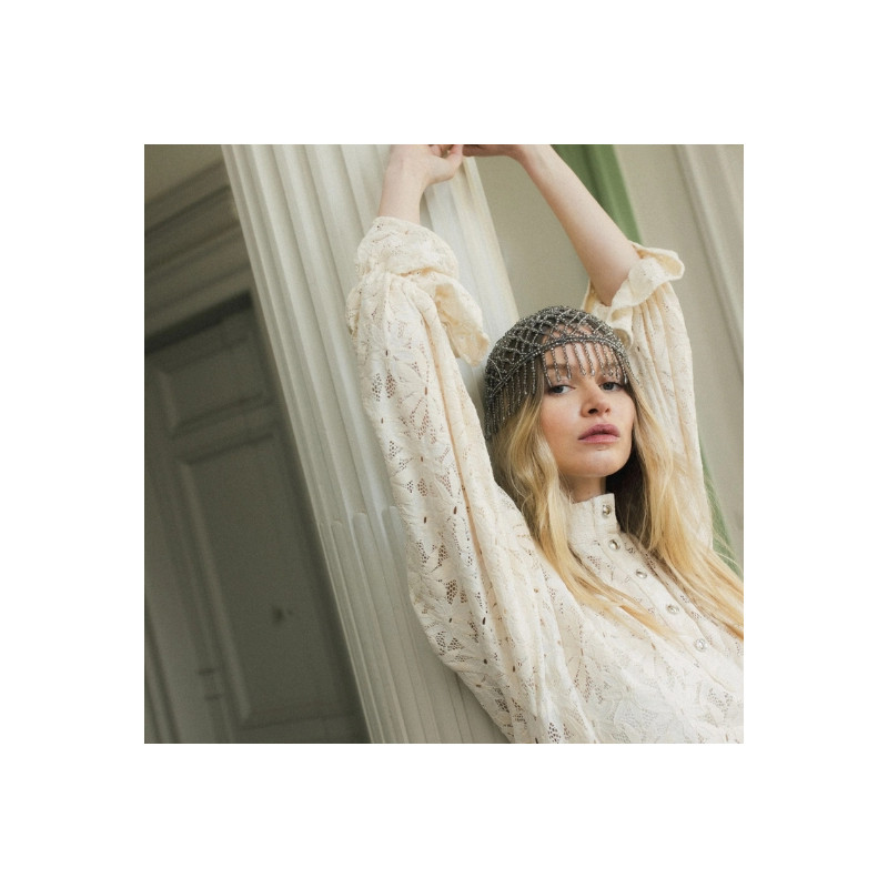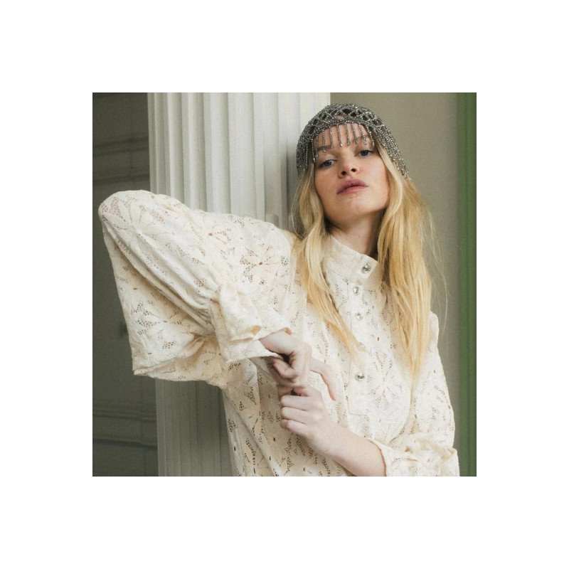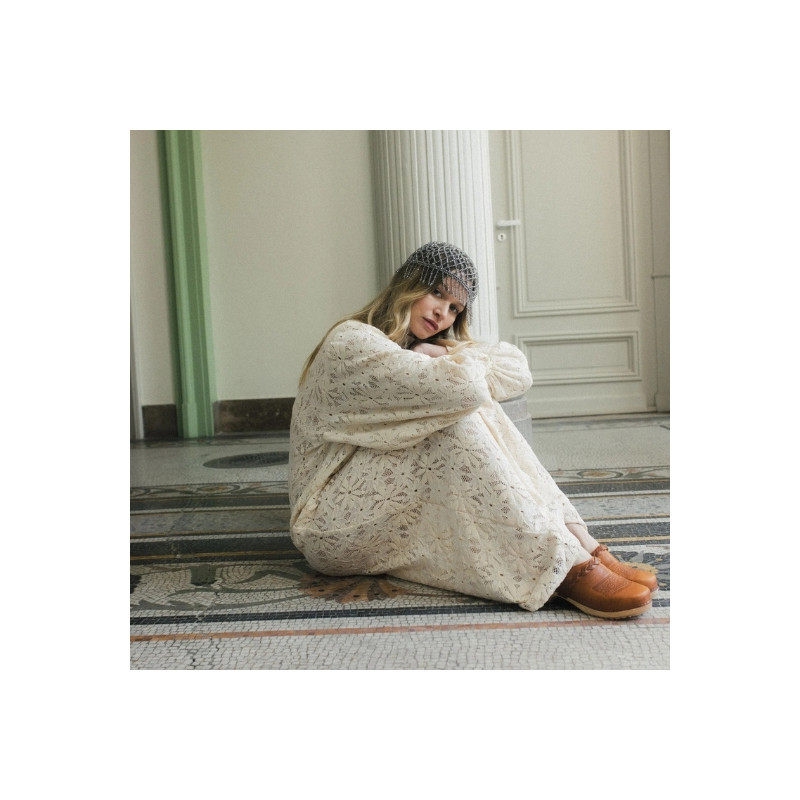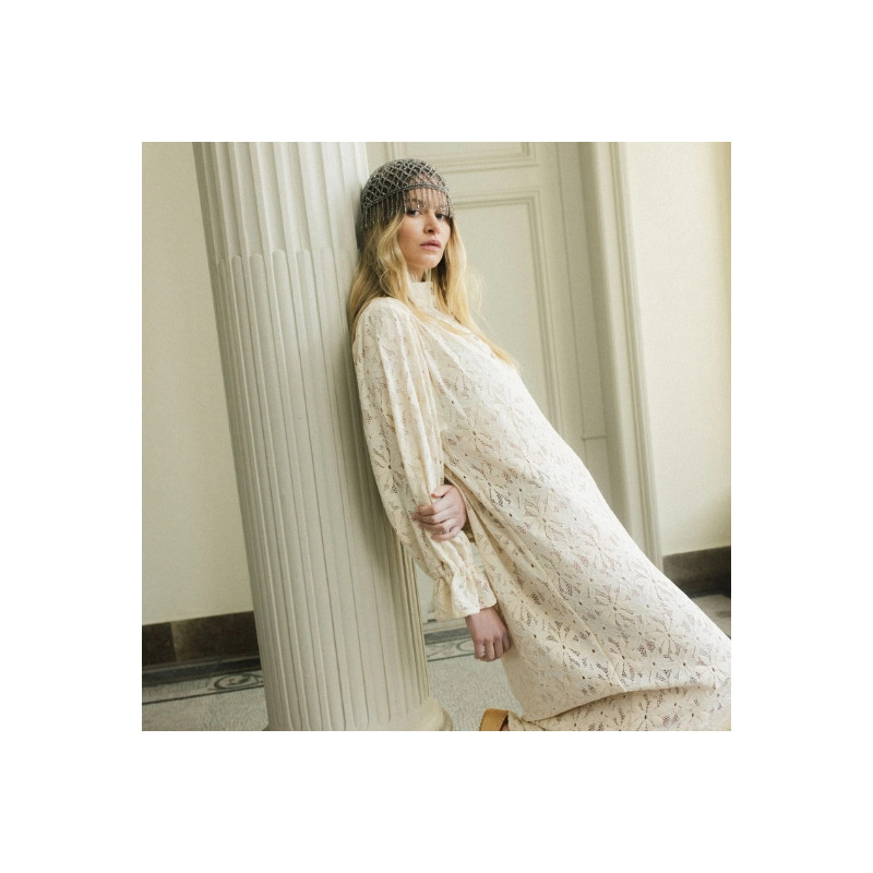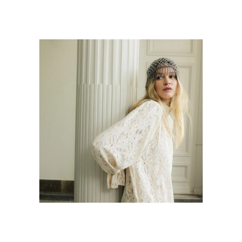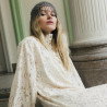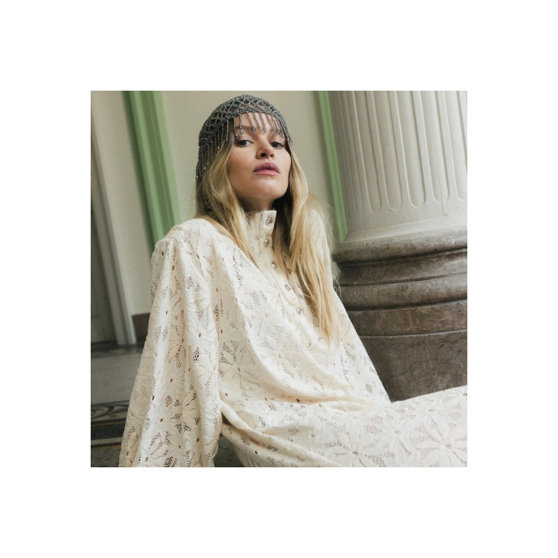 La robe Poe en dentelle de Calais Caudry écru séduit par sa coupe oversize et son motif marguerite inspiré des années 60. Avec ses poignets cloches et ses détails en métal argenté, elle allie allure rétro et modernité.