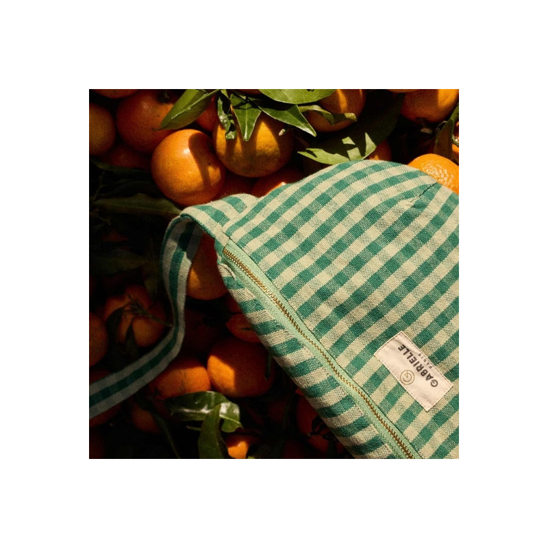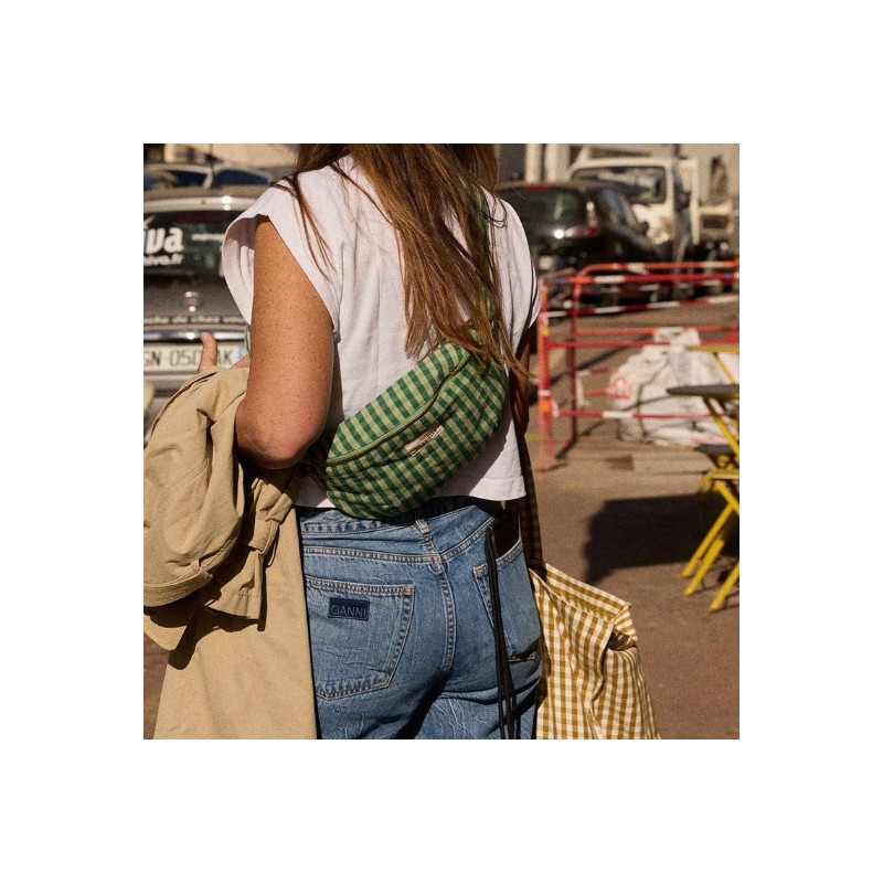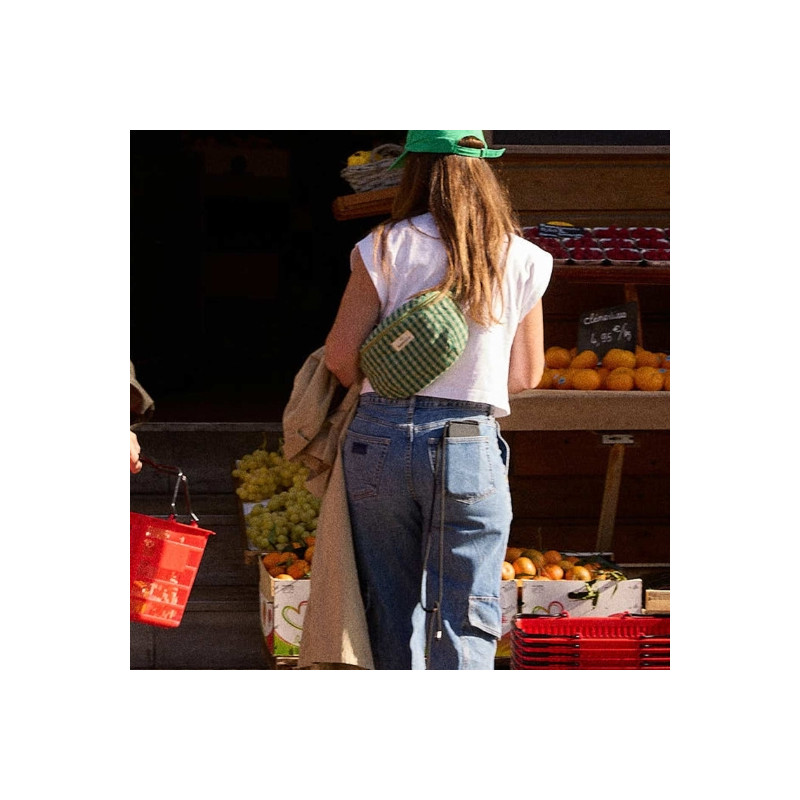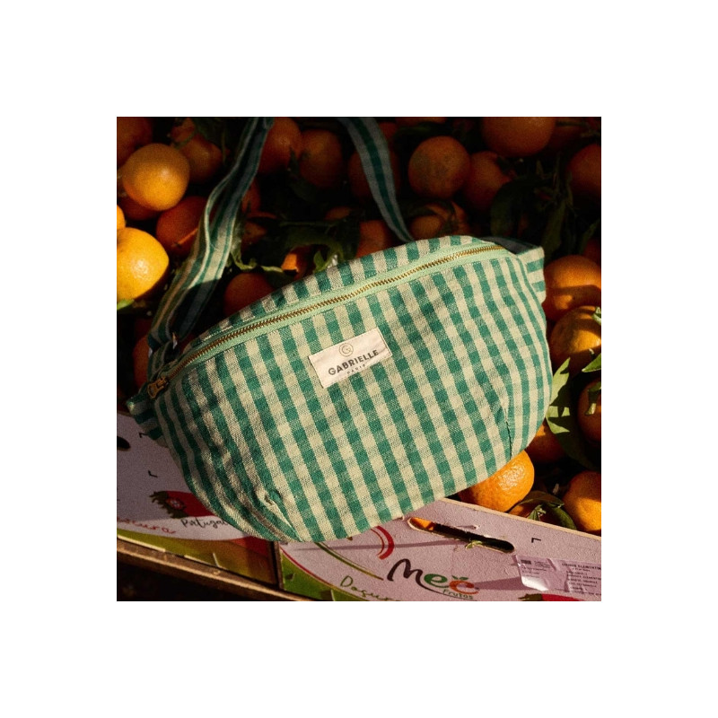 Sac banane Gabrielle Paris en coton vichy menthe. Format 30 x 15 x 8 cm, anse réglable, poche intérieure et fermeture zippée. Lavable en machine à 30°C.