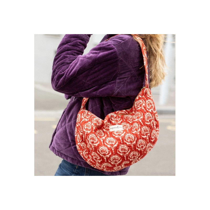 Le sac banane Shanti en velours lisse signé Apaches Collections allie douceur et élégance. Son format lune et sa bandoulière ajustable en font l’accessoire pratique et raffiné, idéal au quotidien comme en escapade.