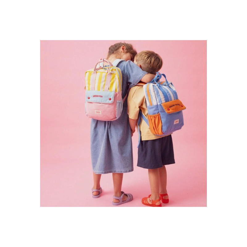 Le sac à dos Amour Fou de chez hamaye, avec ses rayures bleues, allie confort, praticité et style. Disponible en version enfant et adulte, il s’adapte à tous les usages du quotidien.