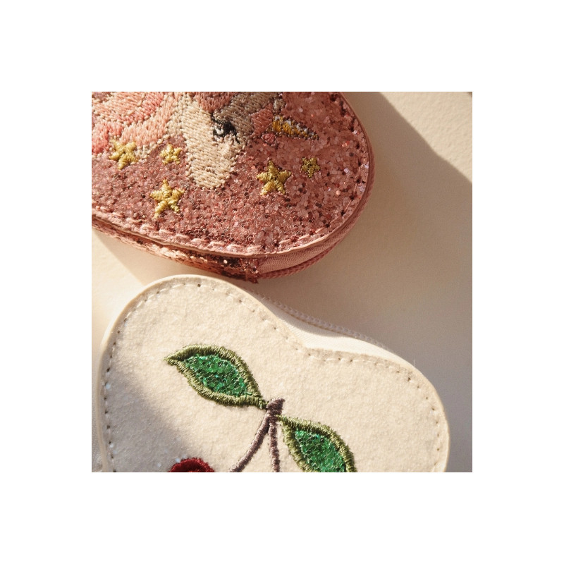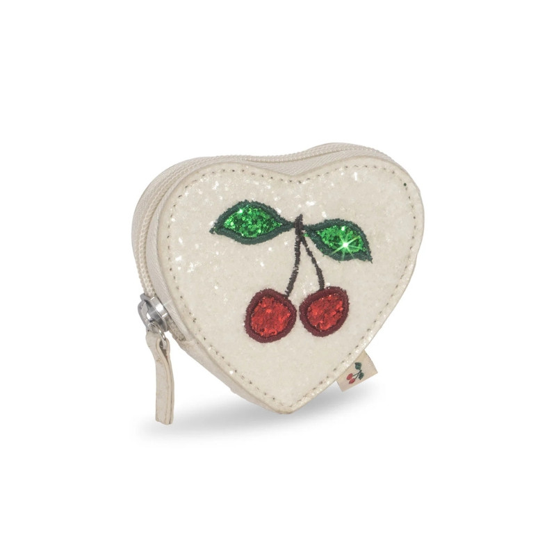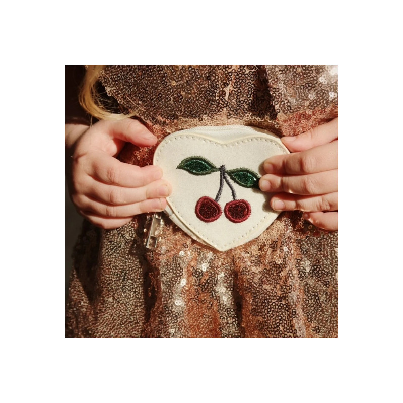 Votre petit bout a besoin d’un endroit sûr pour ranger ses premières pièces ? Ce porte-monnaie en forme de cœur signé Konges Slojd est la solution parfaite ! Avec ses cerises pétillantes en paillettes et sa fermeture éclair facile à manipuler, il allie look et praticité. Idéal pour glisser quelques pièces, des trésors secrets ou même un petit bonbon.