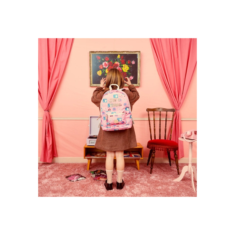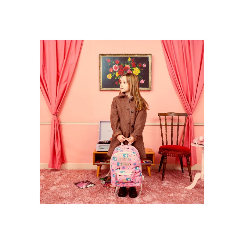 Sac à dos JOJO SONG de Jojo Factory : léger, imperméable et adapté aux formats A4+. En polyester recyclé avec bretelles matelassées, poche avant zippée et broderie bouclette. Détails en cuir naturel. Dimensions : 25 x 33 x 12 cm. Nettoyage à sec conseillé.