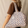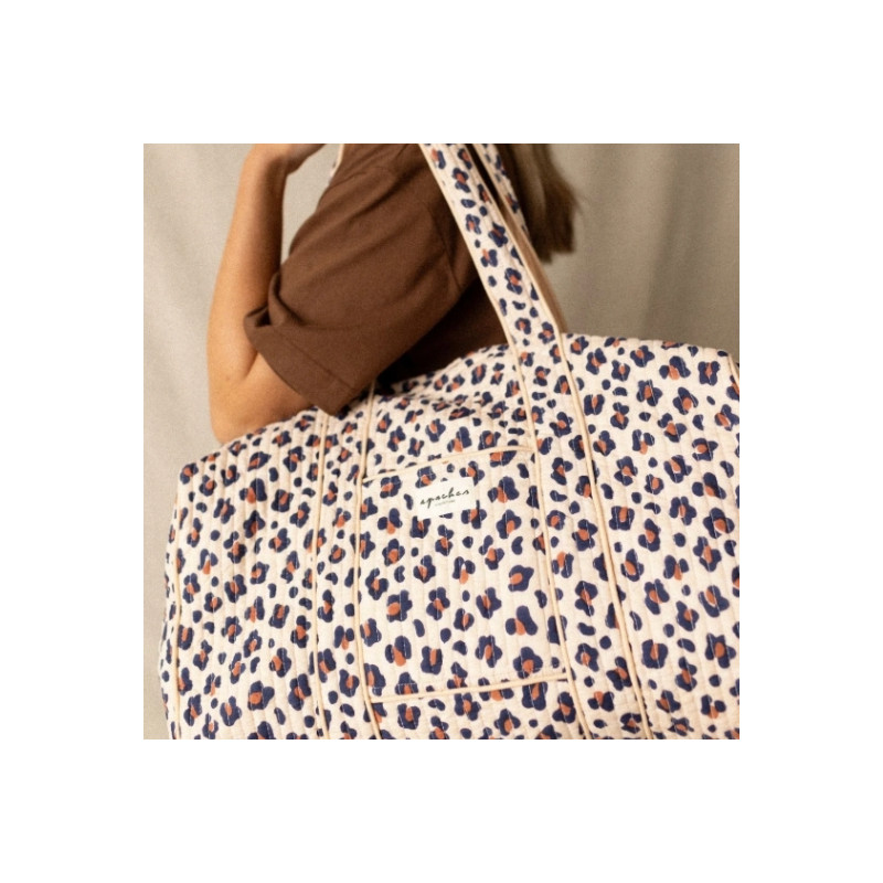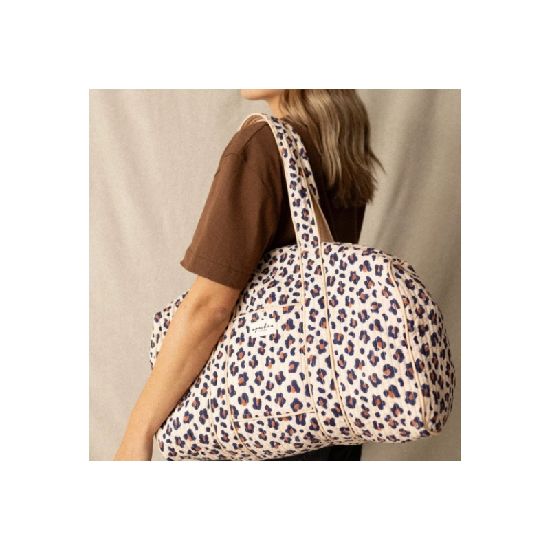 Le sac Buddha en coton matelassé adopte un imprimé léopard félin. Ses poches plaquées facilitent l’organisation. Il peut servir de sac à langer ou de sac 48h. Il est léger, pratique et stylé au quotidien.