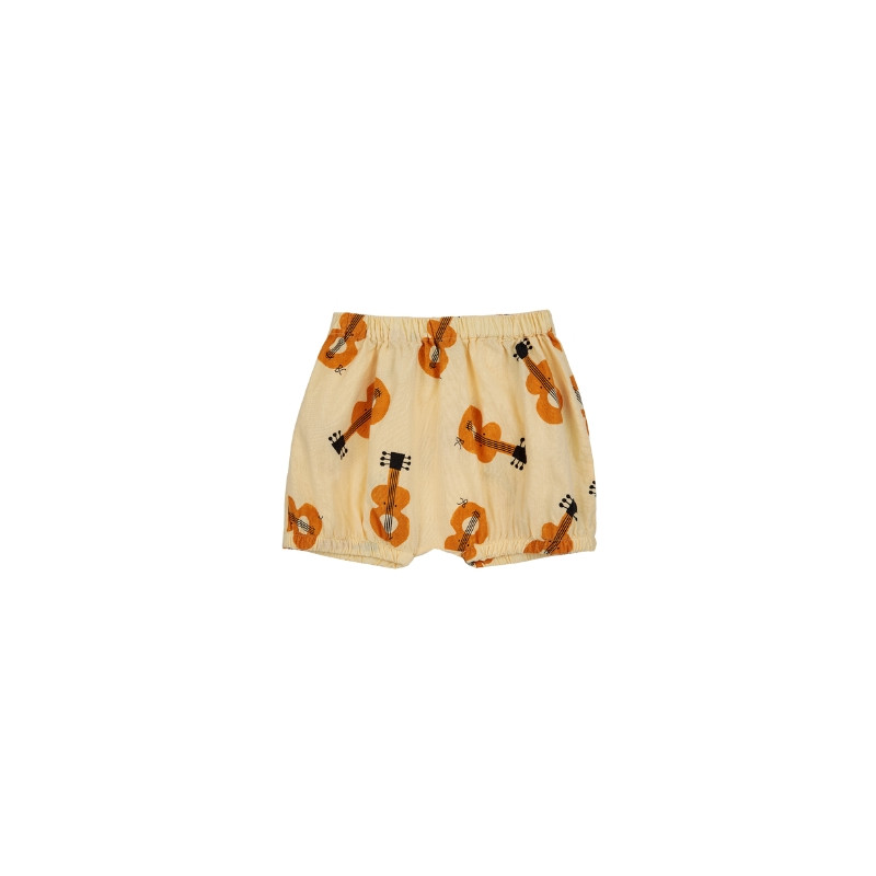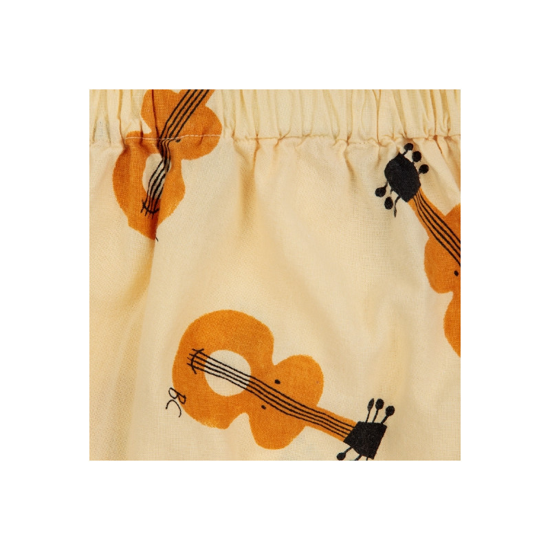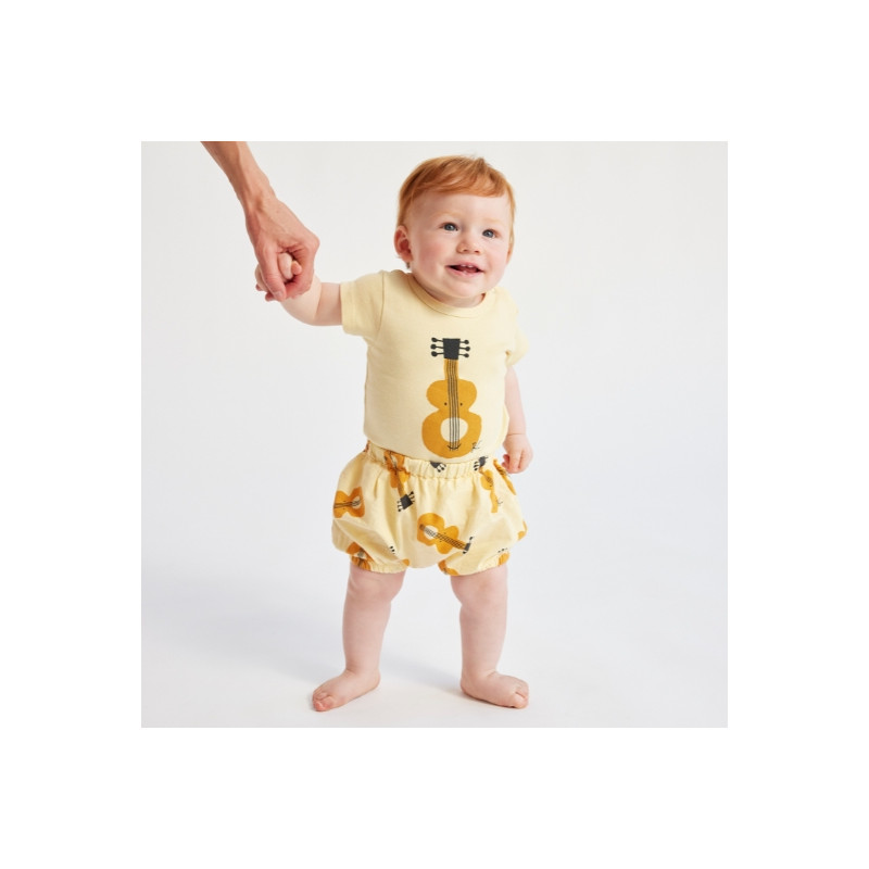 Ce bloomer pour bébé est confectionné en coton biologique. Il est resserré par un élastique à la taille et au niveau des cuisses. Ce bloomer de couleur jaune pastel est orné d'un joli imprimé all-over "guitare".