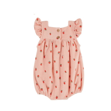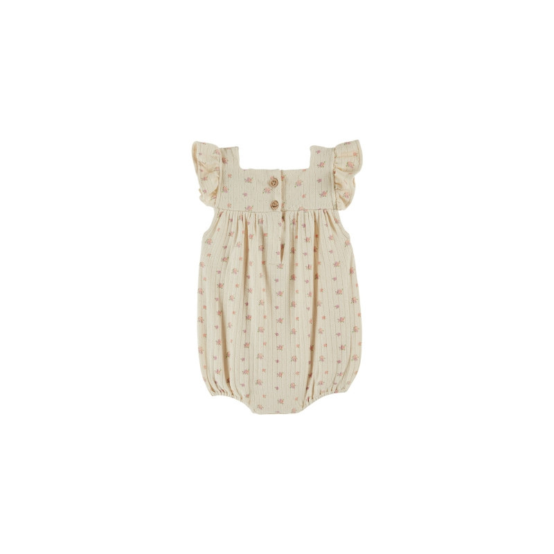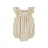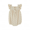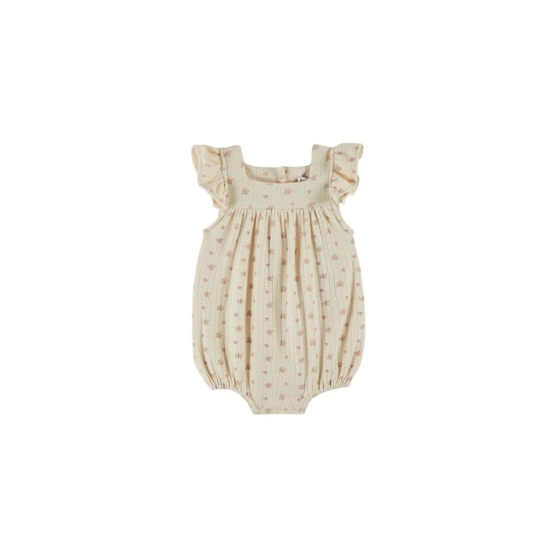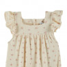 Combibloomer en maille fine couleur crème, délicatement imprimé de petites fleurs rosées. Son tissu légèrement ajouré apporte une touche raffinée tout en restant doux et confortable. Les manches volantées encadrent joliment les épaules, tandis que la taille froncée crée un volume tendre et arrondi. Pressions à l’entrejambe pour un habillage facile au quotidien.