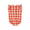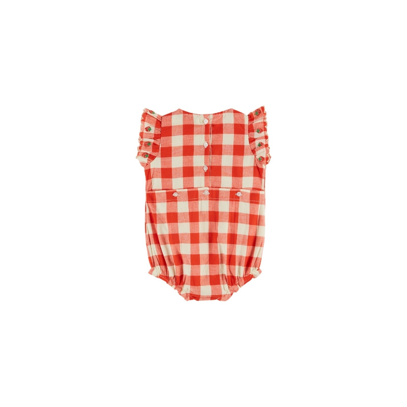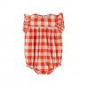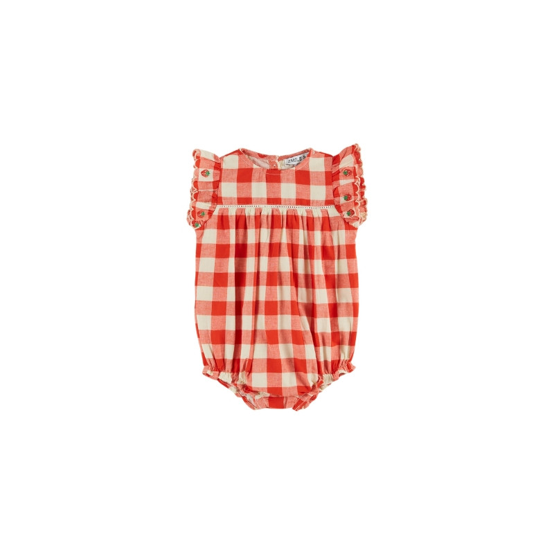Combibloomer bébé en vichy rouge et écru, plein de charme rétro. Coupe ample et confortable avec bas élastiqués pour une jolie silhouette bouffante. Volants aux épaules délicatement brodés de petites fraises et finition festonnée pour une touche gourmande et raffinée. Fermeture pratique au dos pour un habillage facile.