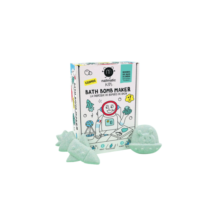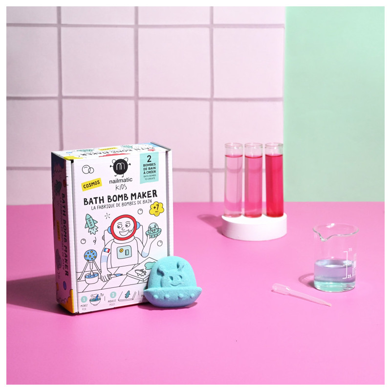 Cette fabrique à boules de bain est parfaite pour occuper vos petits monstres. Ce kit permet de créer 2 bombes de bains en forme de fusée et de soucoupe volante. Une formule qui donne des boules de bain aux priorités lavantes, hydratantes, adoucissantes et apaisantes. Il contient : 1 sachet de bicarbonate coloré (vert), 1 sachet d’acide citrique, 1 pipette et 1 moule de 2 formes (fusée et soucoupe volante). Pour les enfant à partir de 7 ans.