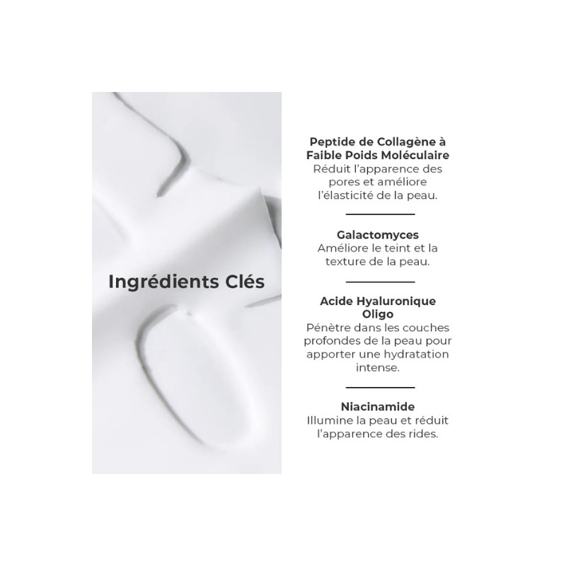 | COMPOSITION | Peptide de collagène de faible poids moléculaire - Galactomyces - Acide hyaluronique oligo - niacinamide |