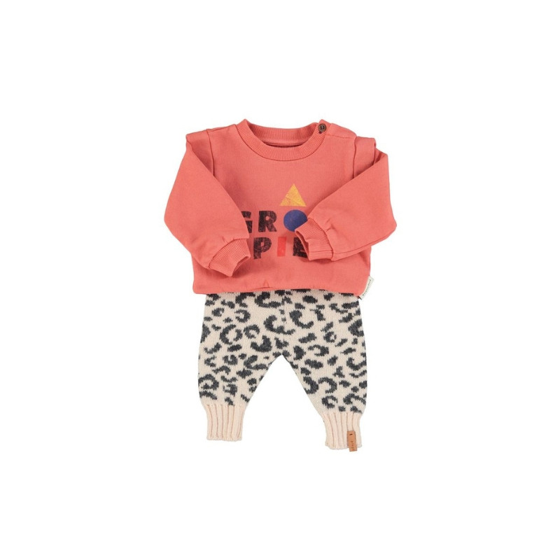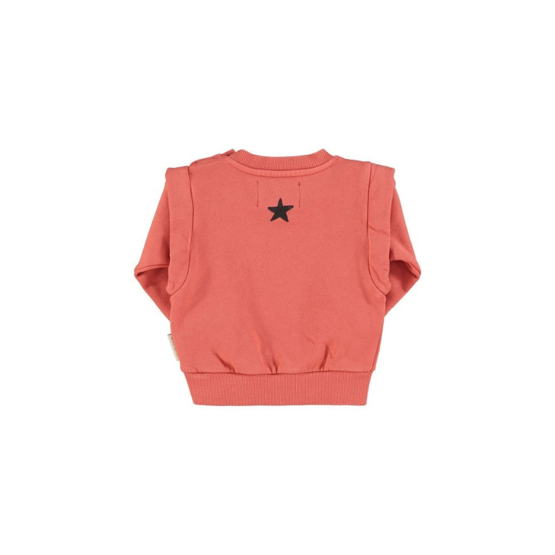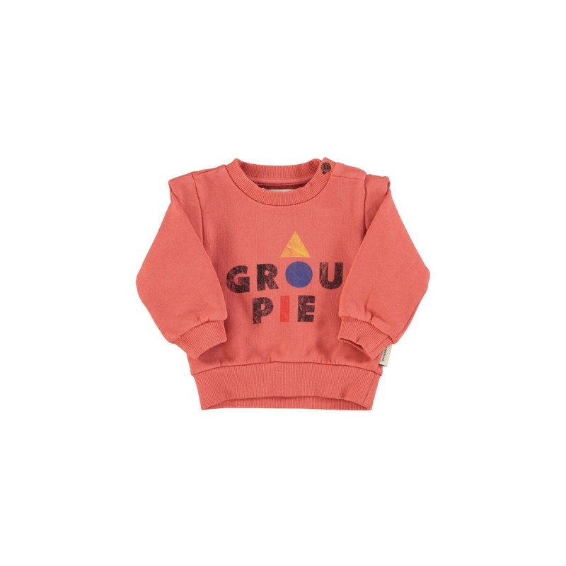 Sweat bébé Piupiuchick AW25 en coton bio rose, avec imprimé "groupie", étoile au dos, poignets côtelés et ouverture à bouton sur l’épaule.