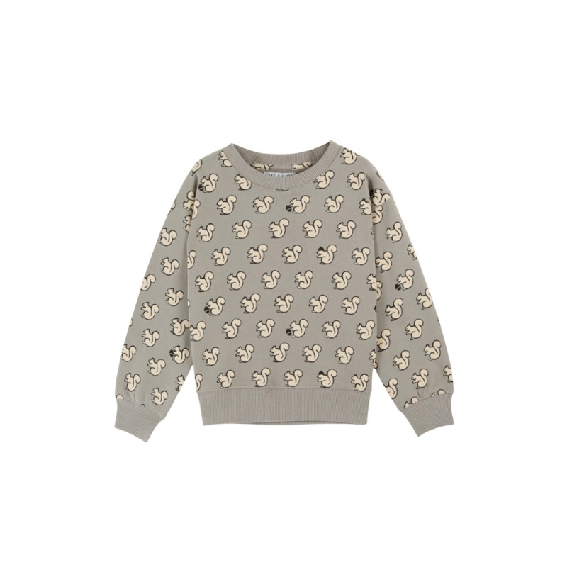 Sweat écureuil gris clair de chez Émile et Ida : un basique tout doux en molleton de coton, rehaussé d’un imprimé écureuils crème.