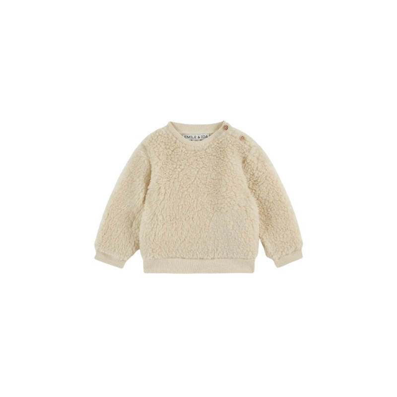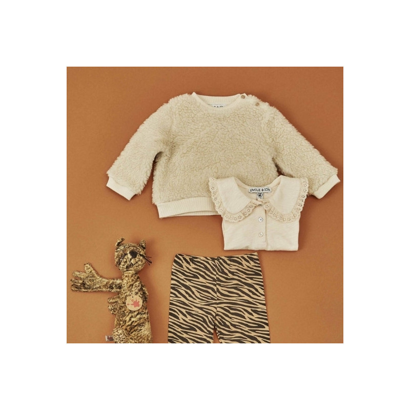 Douillet et irrésistible, le sweat moumoute sherpa écru de la marque Émile et Ida enveloppe les tout-petits de chaleur. Confectionné dans un mélange ultra doux de polyester et de laine, il séduit par sa texture pelucheuse et son confort. Pratique avec son ouverture pressionnée à l’épaule, ce modèle est idéal pour affronter l’hiver avec style et tendresse.