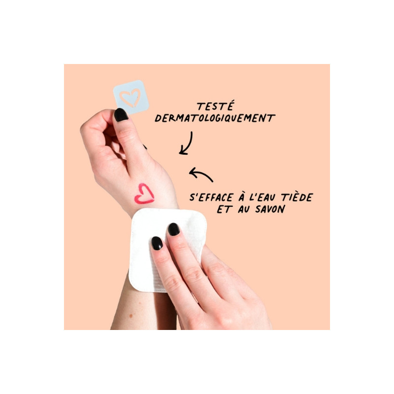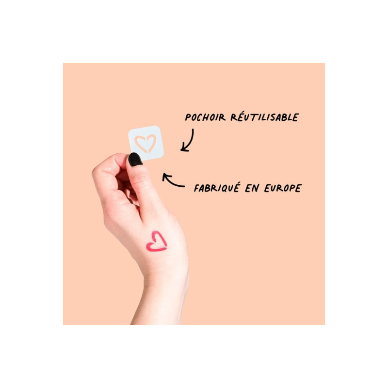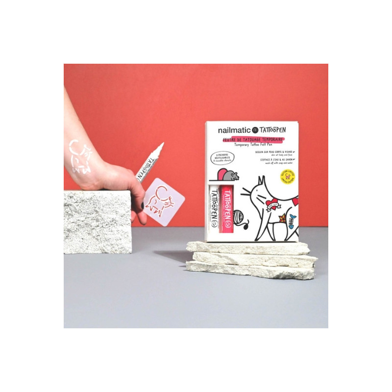 Retrouvez dans ce coffret Nailmatic deux feutres de tatouages temporaire Tattoopen ainsi qu’une planche de 8 pochoirs réutilisables. Grâce à ces pochoirs, votre enfant pourra reproduire facilement des œuvres inspirées de l’univers de l’artiste. Ce coffret est une édition limitée, célébrant l’art de rue et du tatouage. Les deux feutres Tattoopen, rouge et blanc, sont formulés à 60% d’eau et sont testés dermatologiquement. Ils s’utilisent aussi bien sur le corps que sur le visage et s’effacent très facilement avec de l’eau savonneuse.