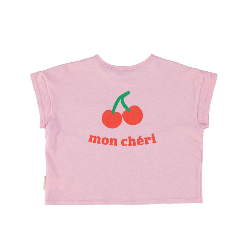 Ce t-shirt couleur lilas de la marque Piupiuchick est conçu en coton biologique. Il est doté de manches courtes, d'un col rond, d'une poche poitrine à bord brut et de deux imprimés rouges sur l'avant et l'arrière du t-shirt.