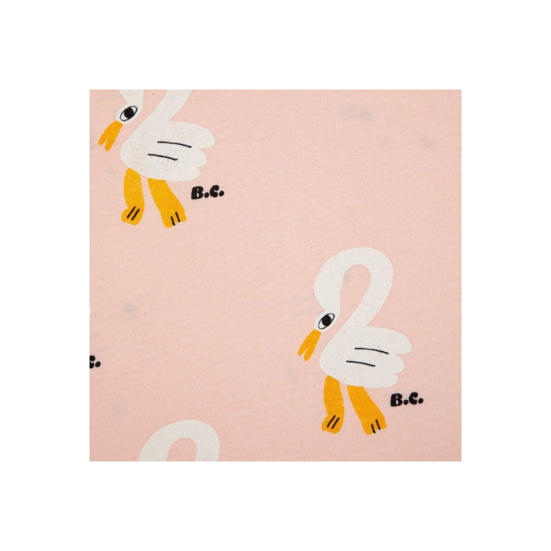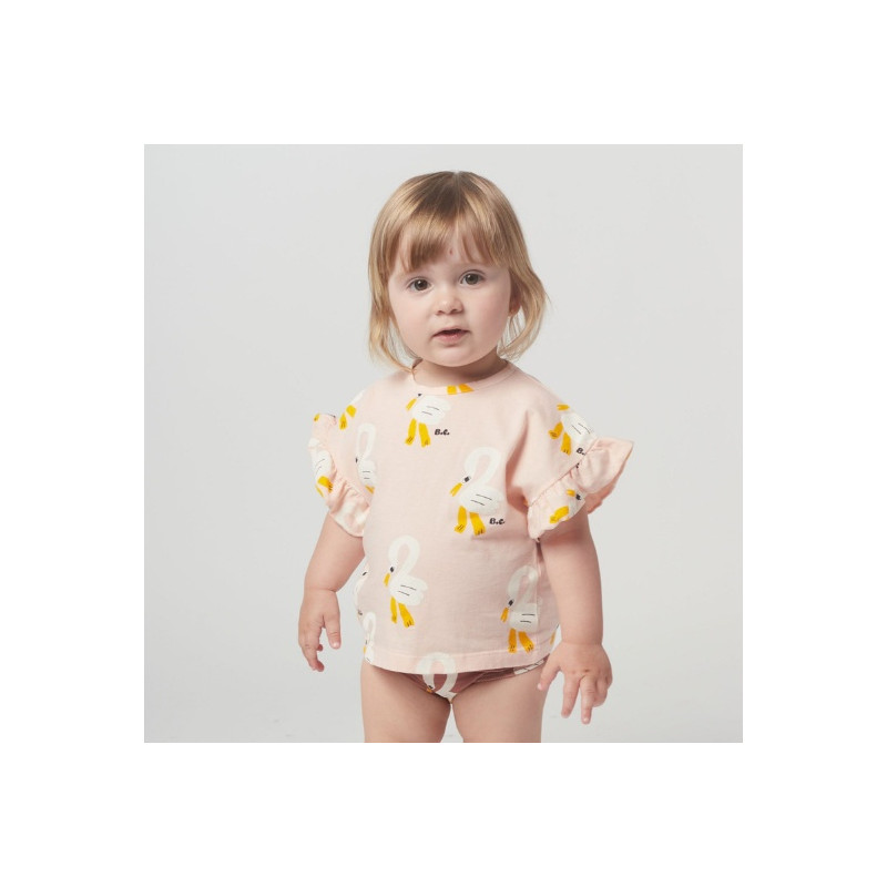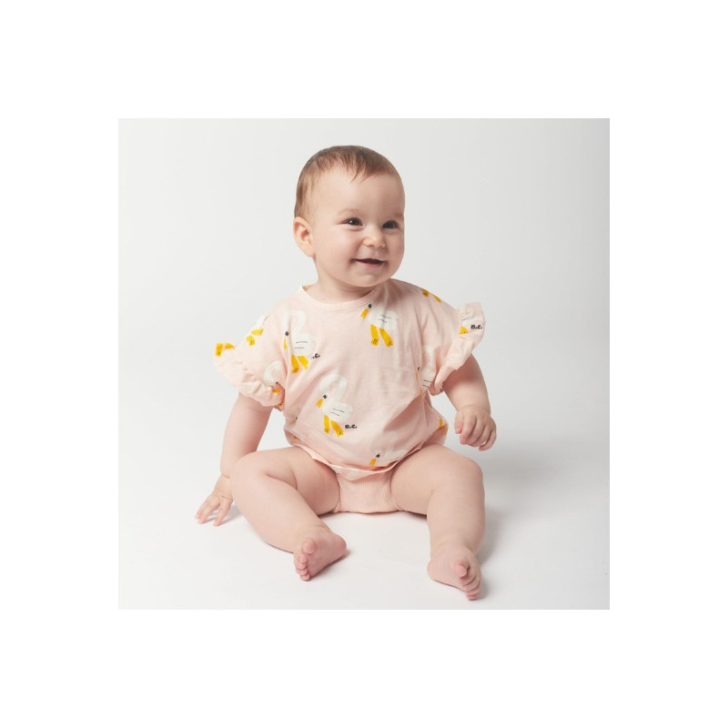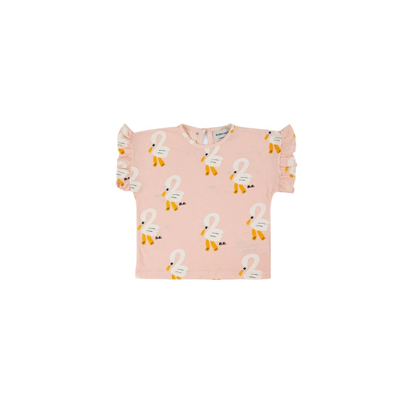 Ce t-shirt au doux coloris rose de la marque Bobo Choses a un joli imprimé all-over pélicans. Il est doté de manches courtes, d'une fermeture à boutons dans le dos et de petits volants sur les manches. Il a une coupe ample et est conçu en coton biologique.