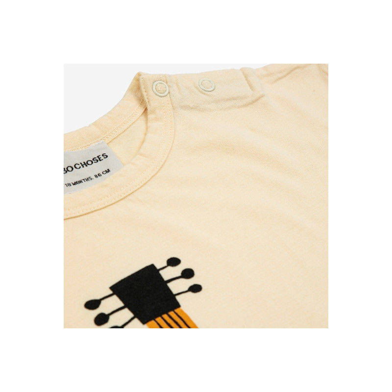 Ce t-shirt en coton dispose de manches courtes, d'un col rond et d'un petit bouton-pression sur l'épaule pour faciliter l'habillage de bébé. Il est de couleur jaune clair et est orné d'un imprimé "guitare" jaune et noir sur l'avant.