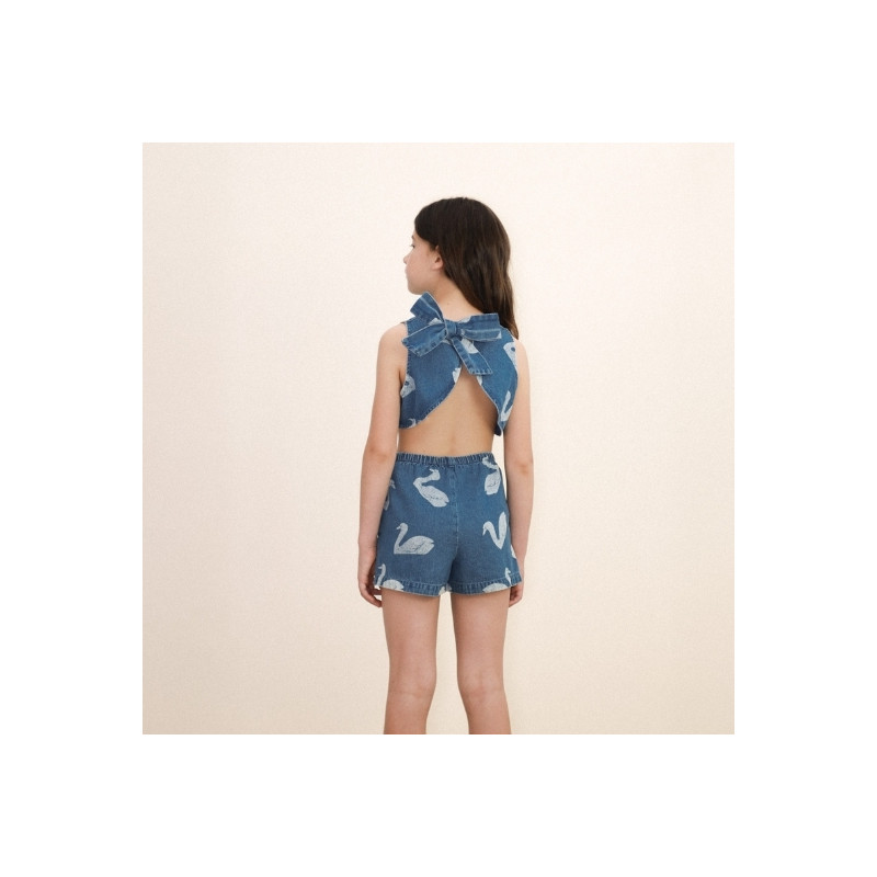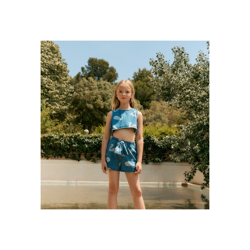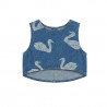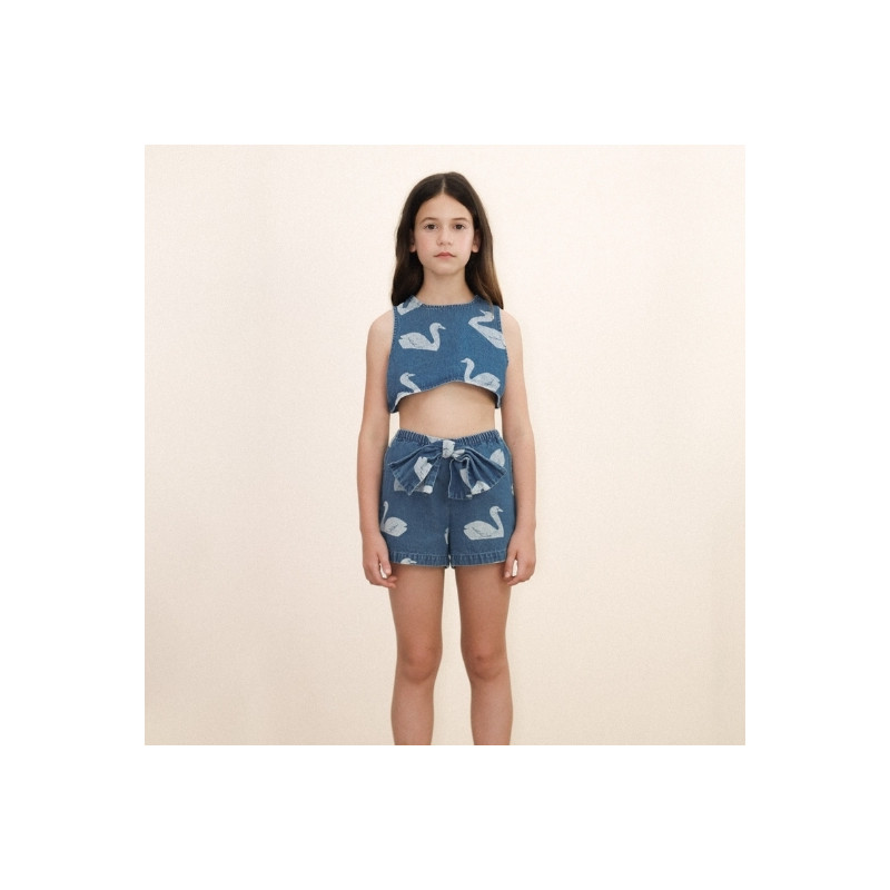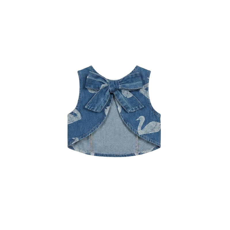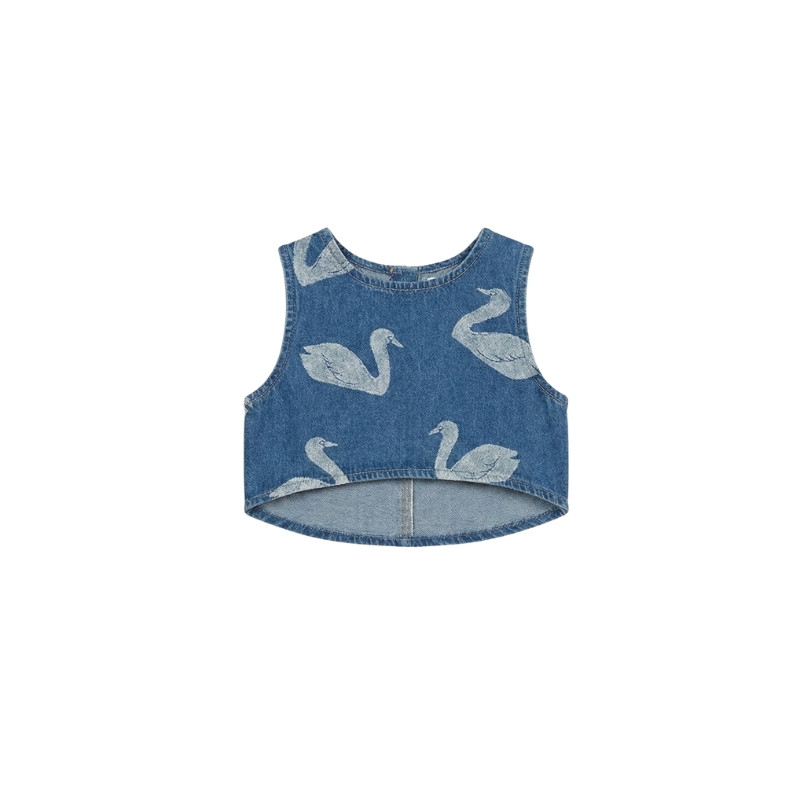Top sans manches Tiny Cottons en denim bleu, orné d’un imprimé cygnes et d’un nœud au dos. Une pièce originale et confortable, idéale pour composer des tenues estivales pleines de charme.